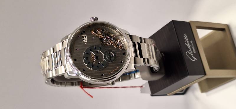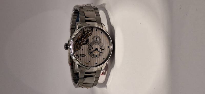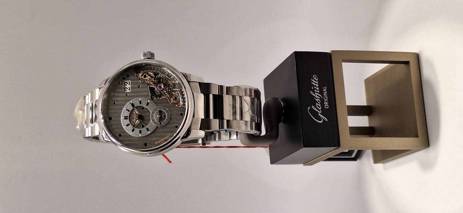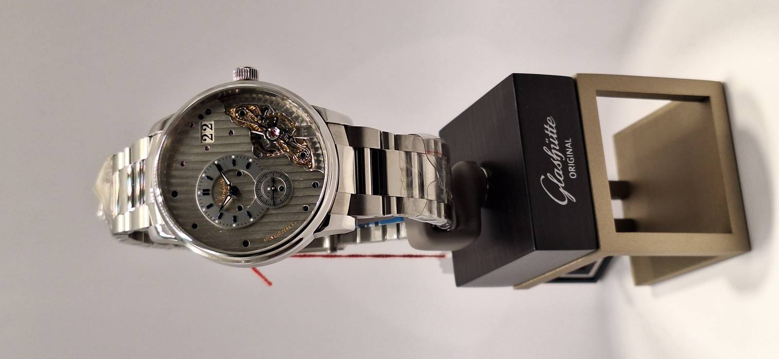 Orologio nuovo a carica automatica con indicazione di ore, minuti e piccoli secondi. Data panoramica e doppio collo di cigno sul lato quadrante. Bracciale in acciaio e cassa in acciaio diametro mm 42 e spessore mm 12,3. Vetro zaffiro superiore e fondello in vetro zaffiro. Movimento di manifattura cal. 91-02 con doppia regolazione micrometrica a "collo di cigno" sul lato quadrante. Rotore con applicazioni in oro 21 Kt e impermeabilità a 5 bar.