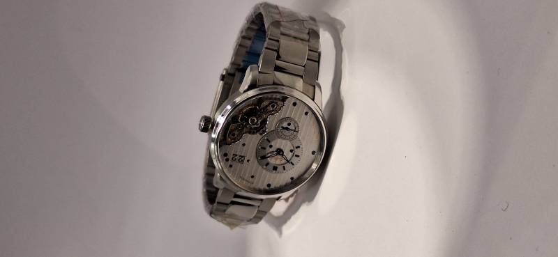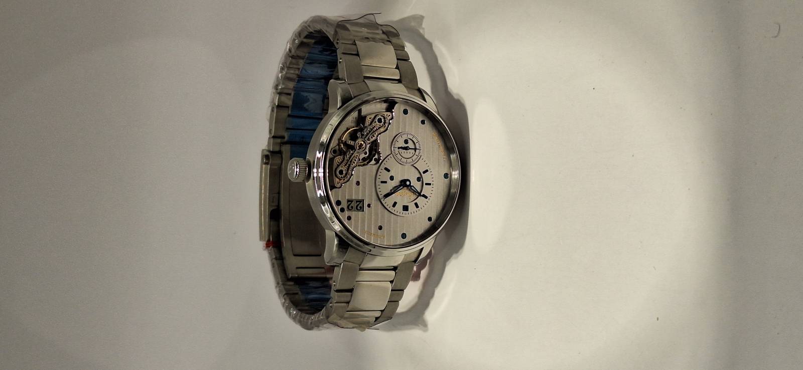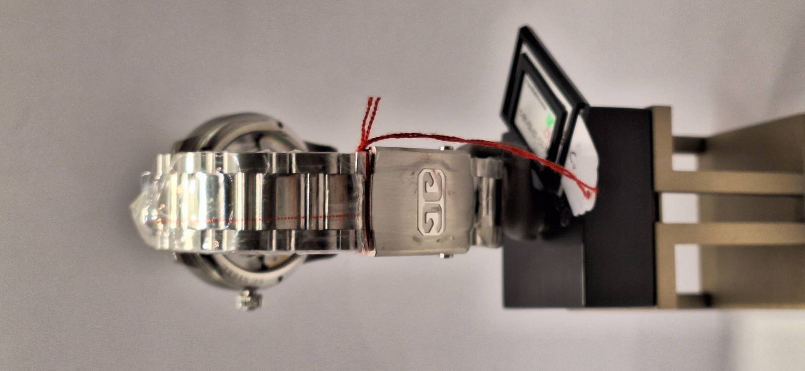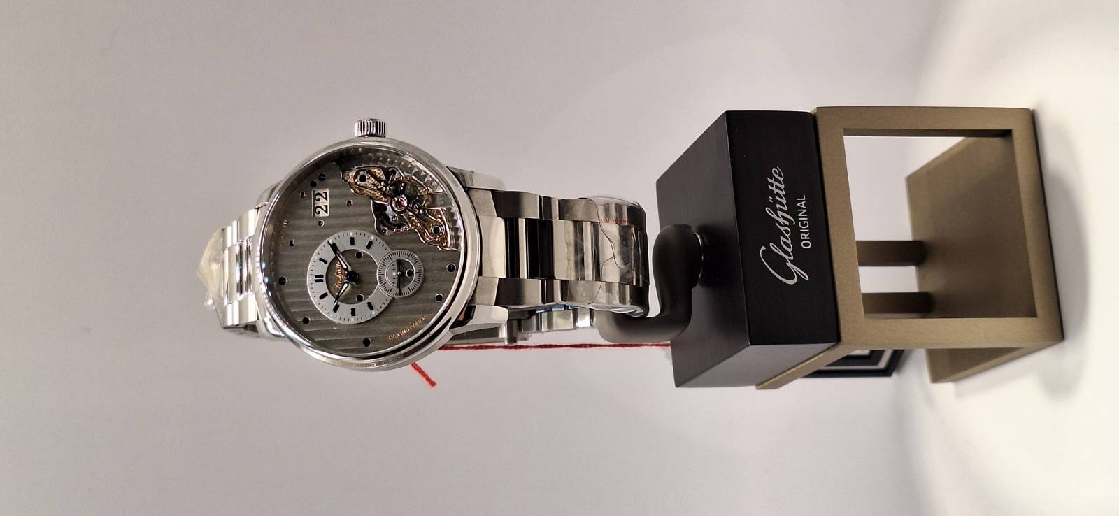 Orologio nuovo a carica automatica con indicazione di ore, minuti e piccoli secondi. Data panoramica e doppio collo di cigno sul lato quadrante. Bracciale in acciaio e cassa in acciaio diametro mm 42 e spessore mm 12,3. Vetro zaffiro superiore e fondello in vetro zaffiro. Movimento di manifattura cal. 91-02 con doppia regolazione micrometrica a "collo di cigno" sul lato quadrante. Rotore con applicazioni in oro 21 Kt e impermeabilità a 5 bar.