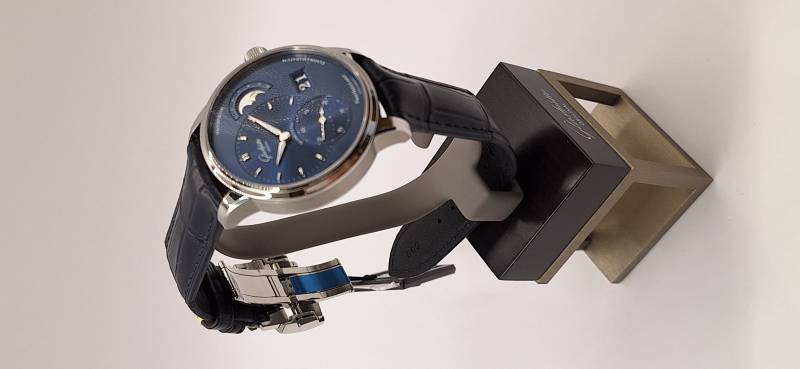 Orologio nuovo; carica automatica, data panoramica; fasi di luna; vetro zaffiro; fondello in vetro zaffiro. Movimento calibro 90 di manifattura Glashutte;