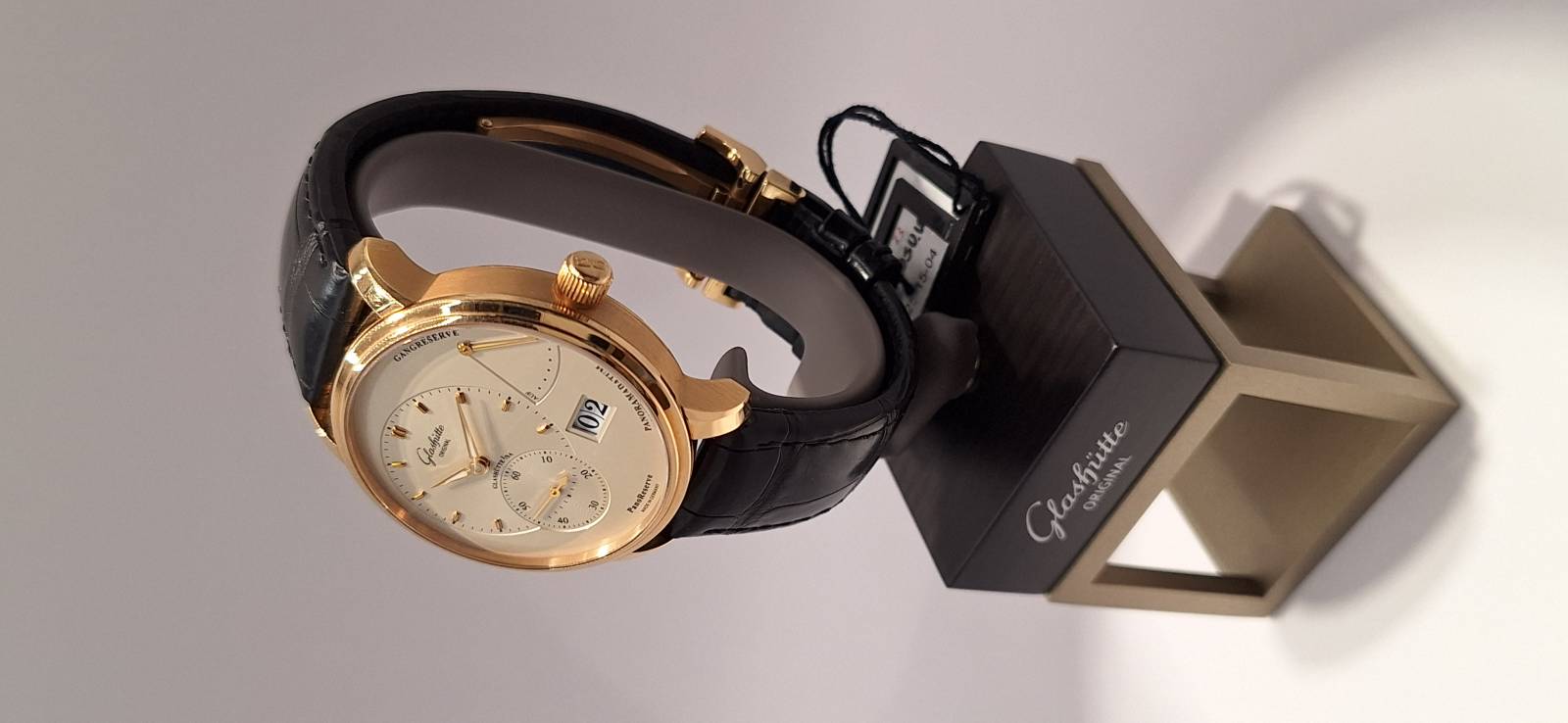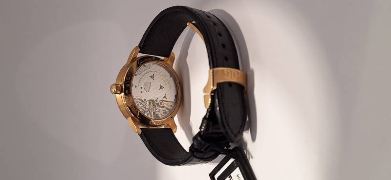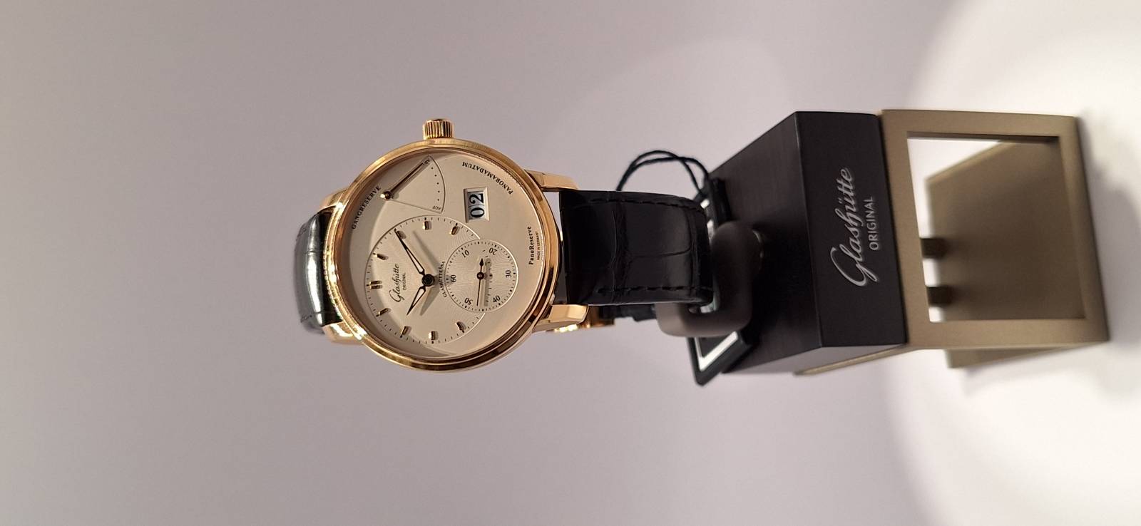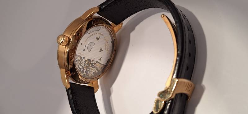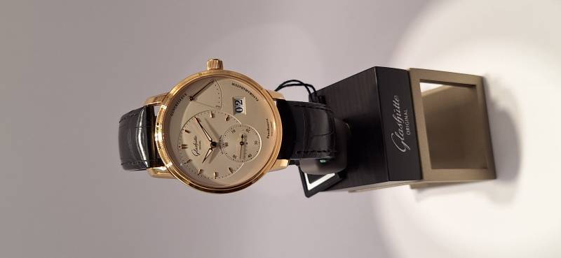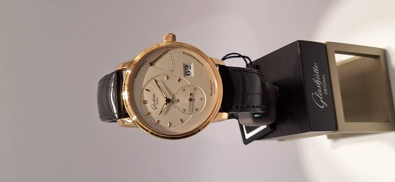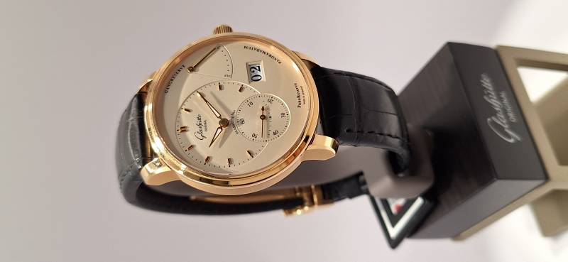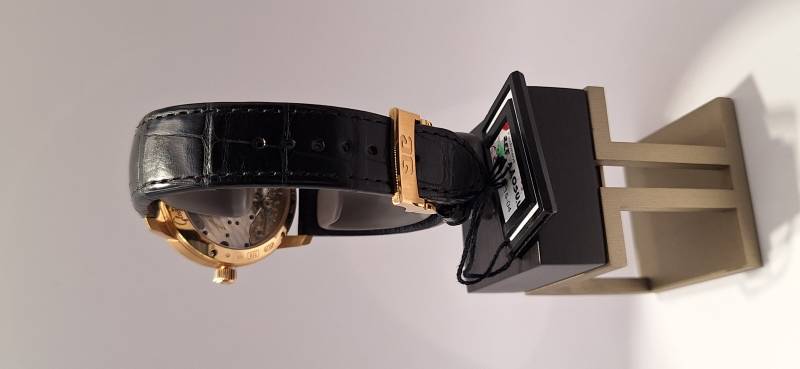 Orologio nuovo a carica manuale con indicazione della riserva di carica, data panoramica e secondi indipendenti al 6, diametro cassa mm 40, spessore mm 11,7, vetro zaffiro superiore e fondello in vetro zaffiro,movimento calibro 65-01 di manifattura con regolazione a collo di cigno