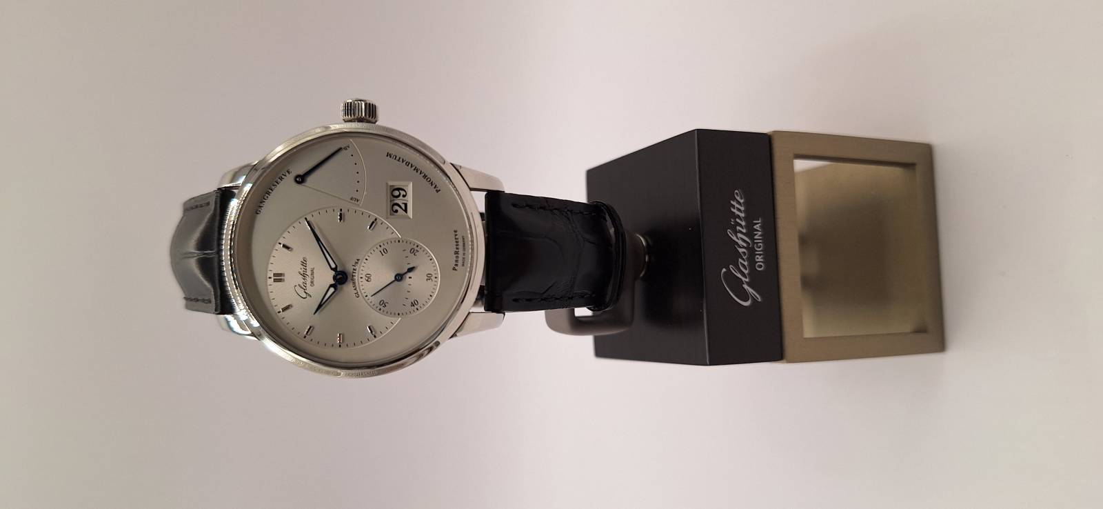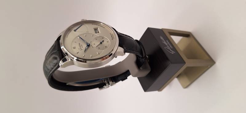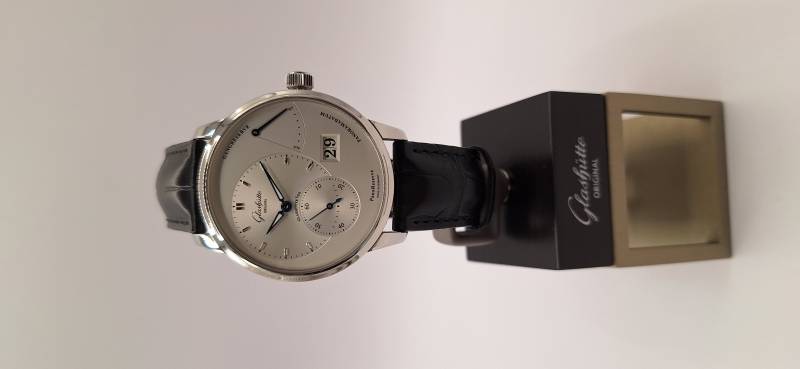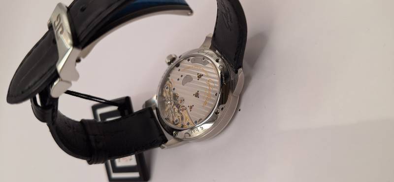Orologio nuovo a carica manuale con indicazione della riserva di carica, data panoramica e secondi indipendenti al 6, diametro cassa mm 40, spessore mm 11,7, vetro zaffiro superiore e fondello in vetro zaffiro,movimento calibro 65-01 di manifattura con regolazione a collo di cigno