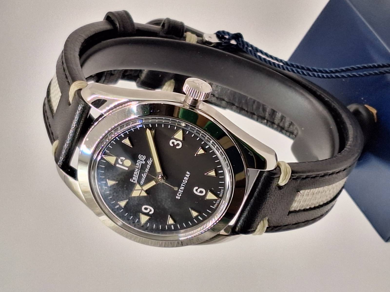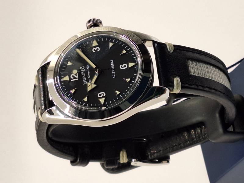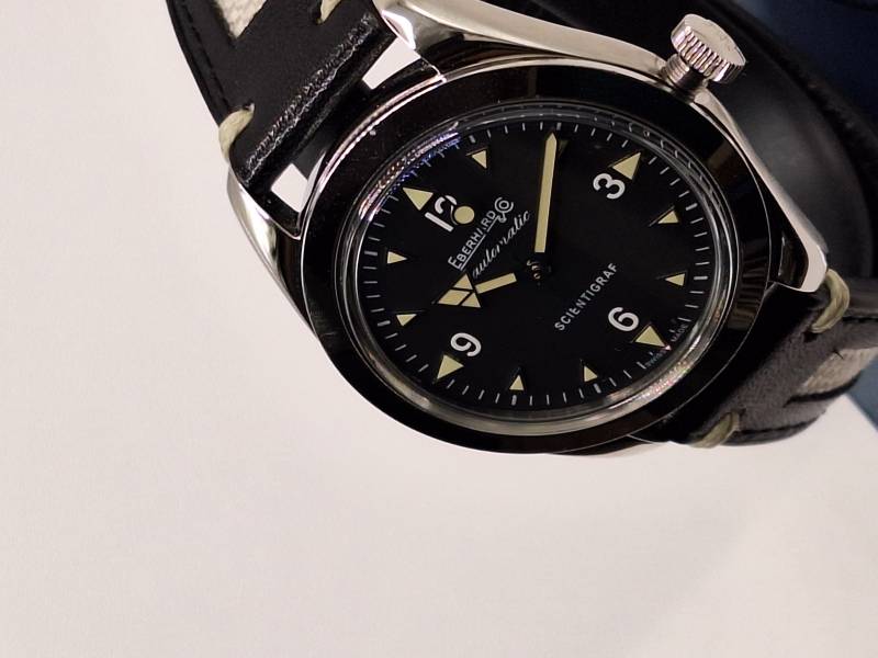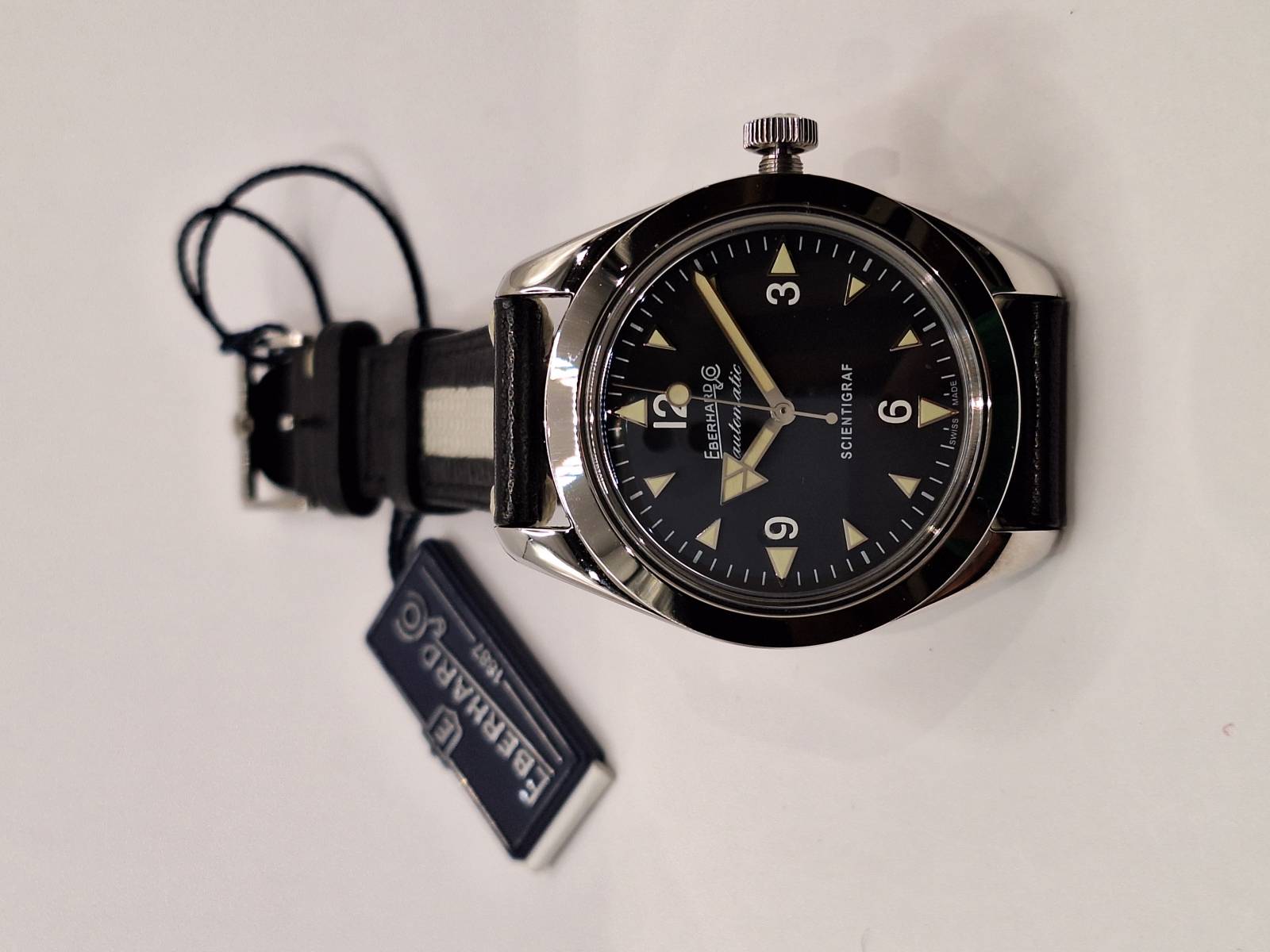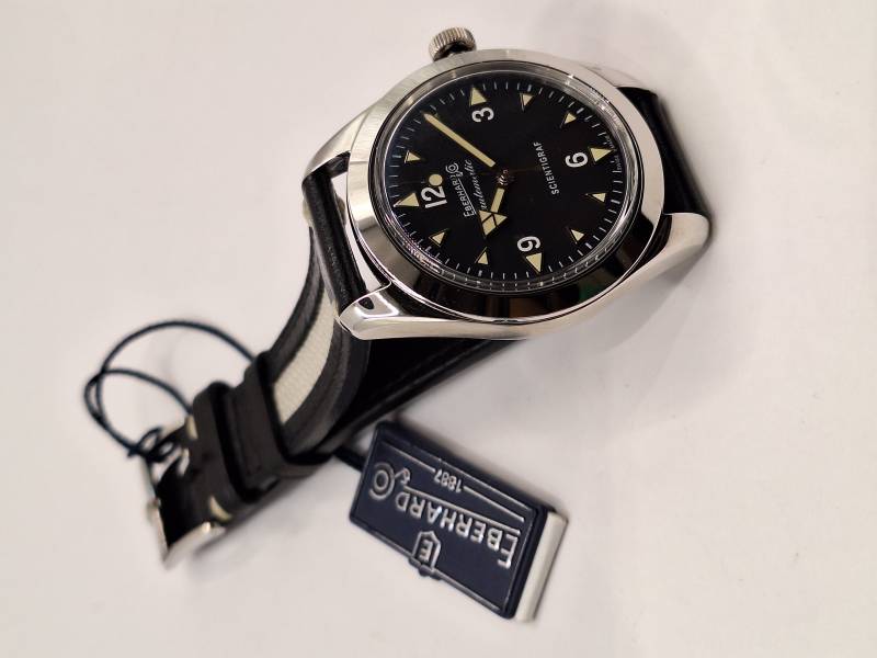 Orologio nuovo a carica automatica con indicazione di ore, minuti e secondi al centro. Cassa in acciaio diametro 41 mm con corona a vite e fondello avvitato recante il disegno di un magnete. Impermeabile a 100 mt. Vetro zaffiro antiriflesso e indici e lancette con luminosità vintage