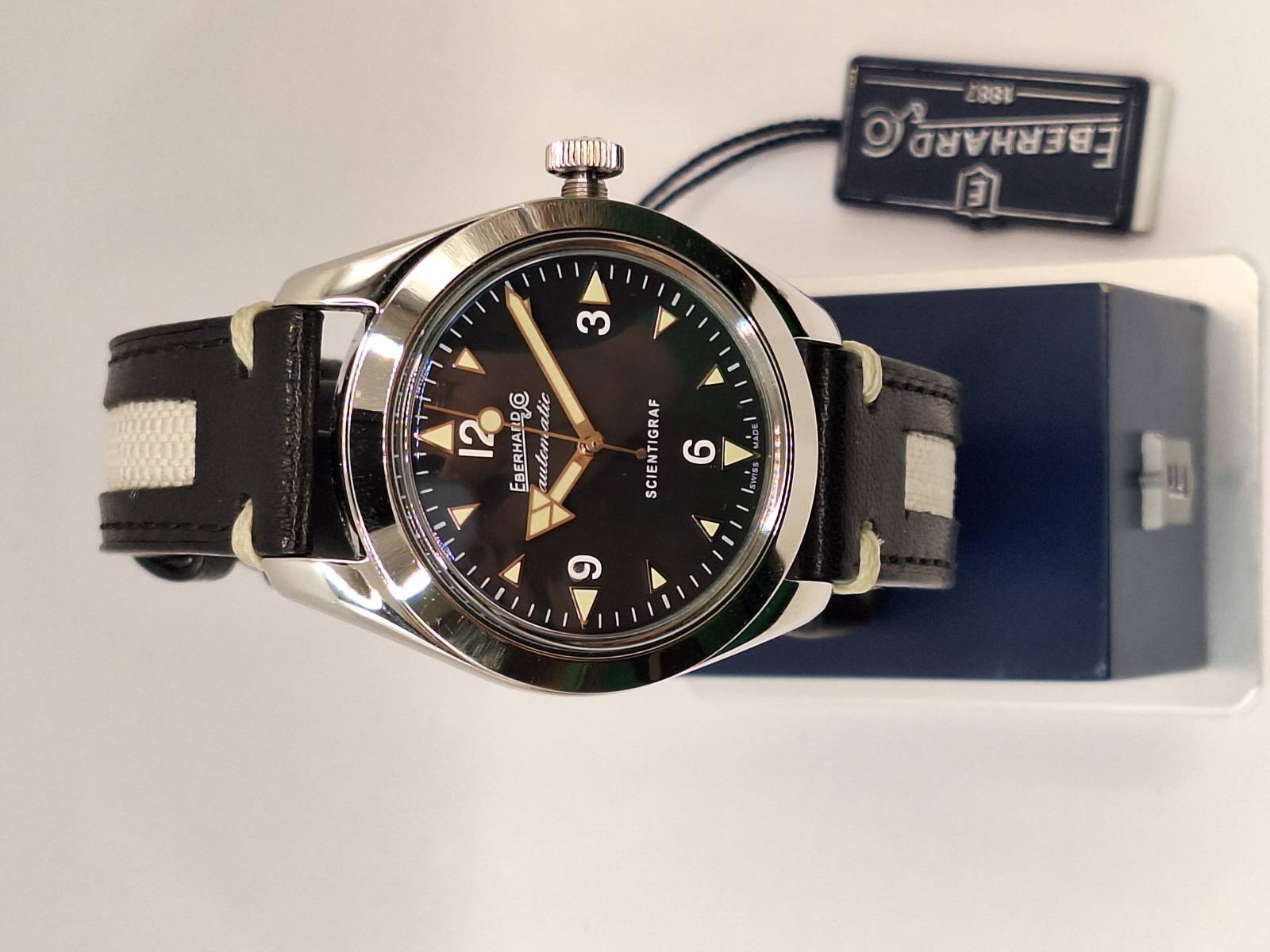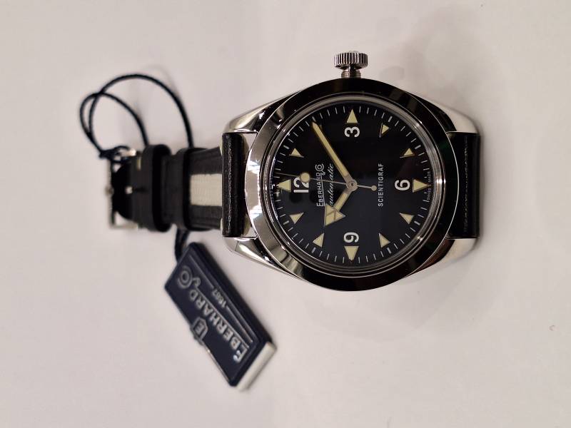 Orologio nuovo a carica automatica con indicazione di ore, minuti e secondi al centro. Cassa in acciaio diametro 41 mm con corona a vite e fondello avvitato recante il disegno di un magnete. Impermeabile a 100 mt