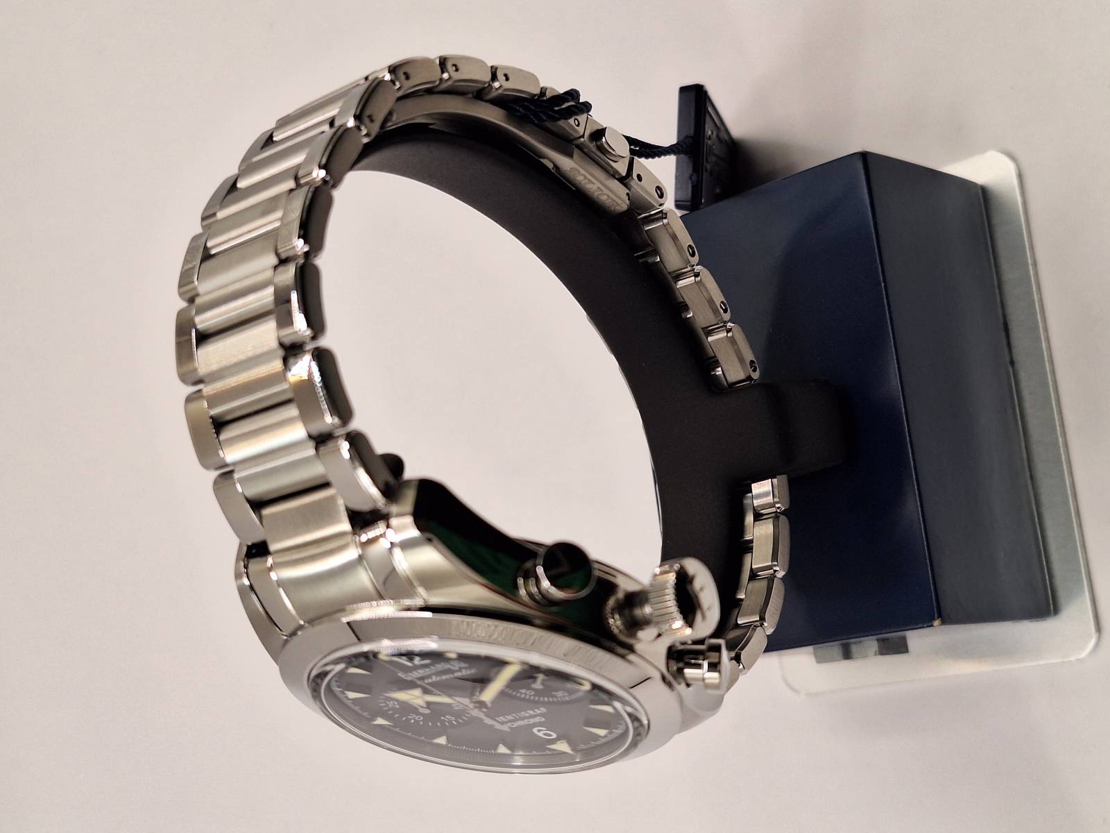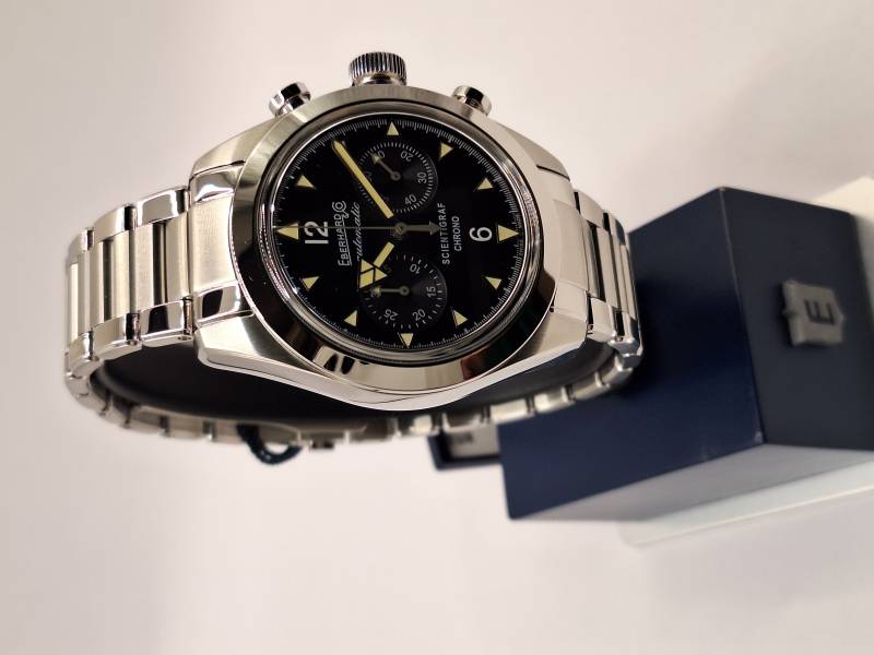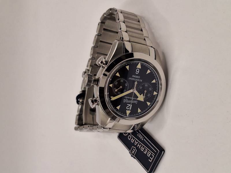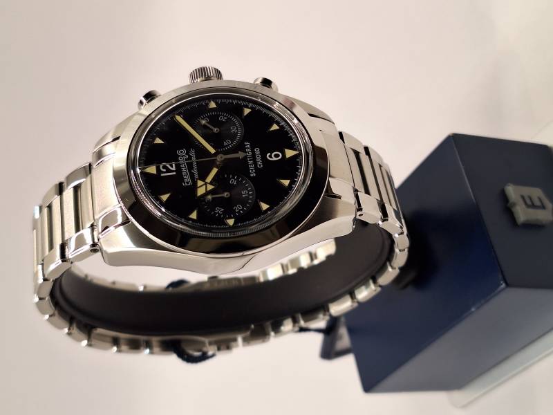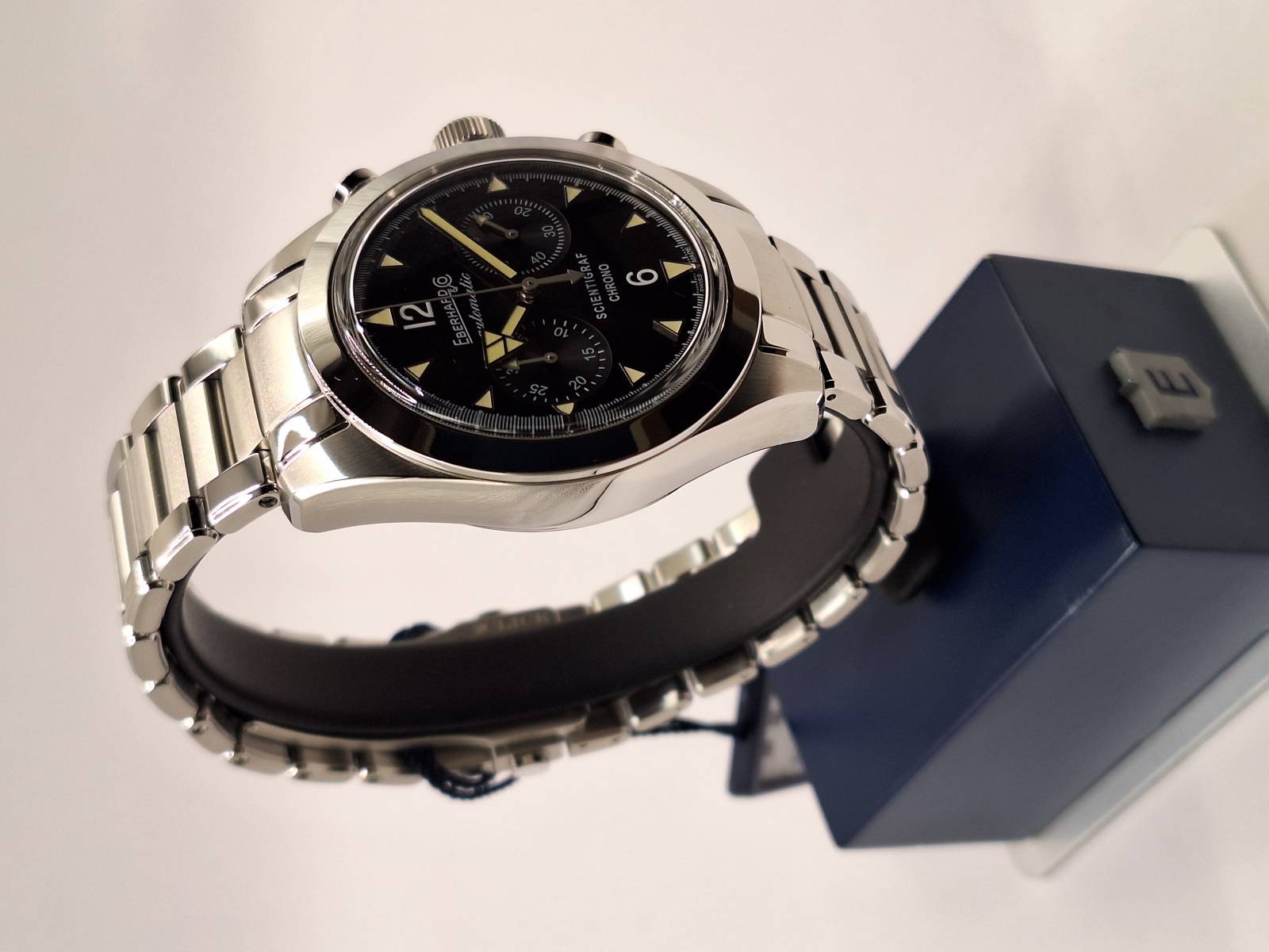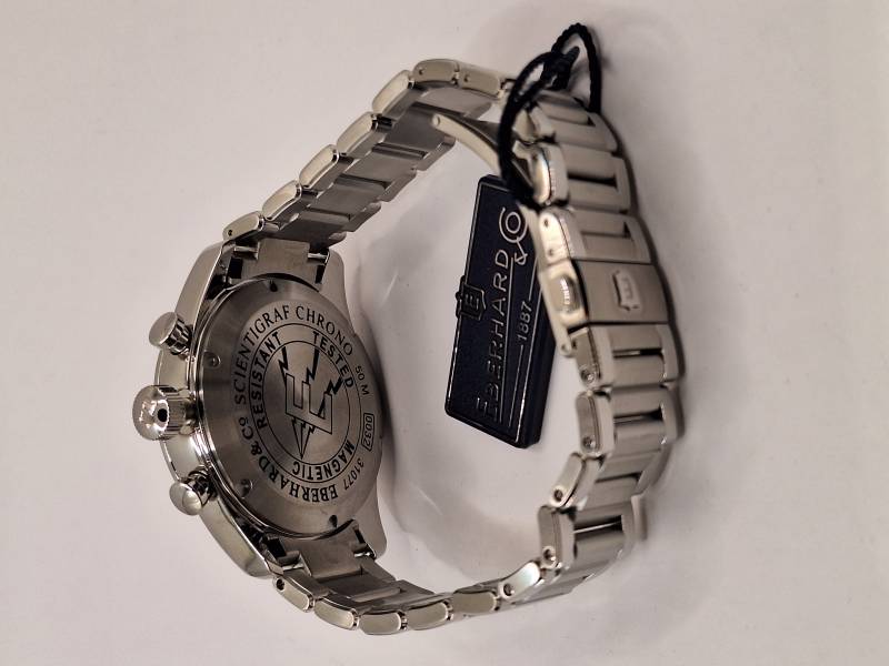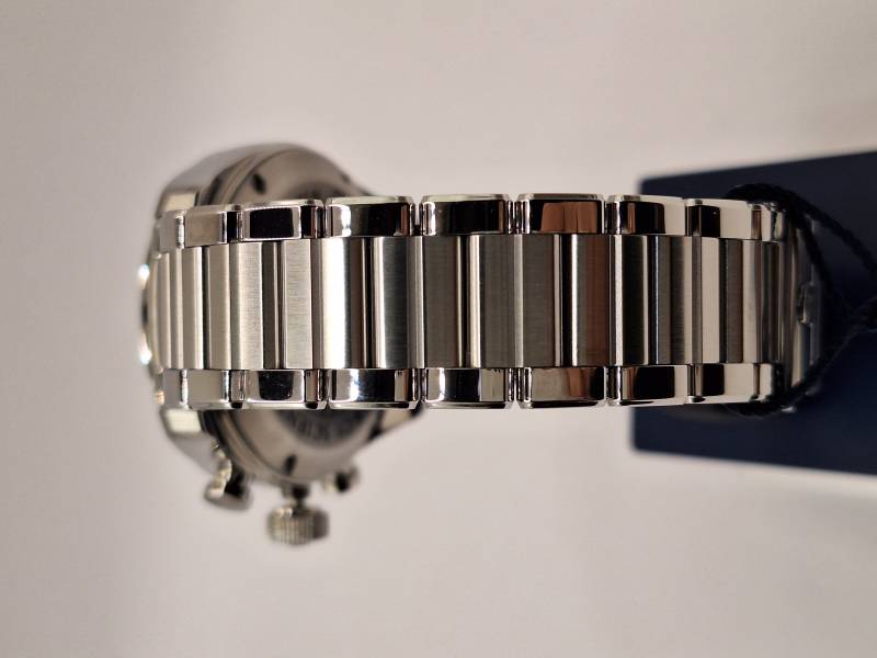 Orologio nuovo a carica automatica, cronografo con totalizzatore dei 30minuti e dei secondi. Cassa in acciaio diametro 41 mm e cassa interna in ferro dolce per la protezione dai campi magnetici. Fondello avvitato con incisione di un magnete, corona avvitata e pulsanti a pressione. Impermeabilità a 50 mt. Bracciale Chassis in acciaio con chiusura 2Click