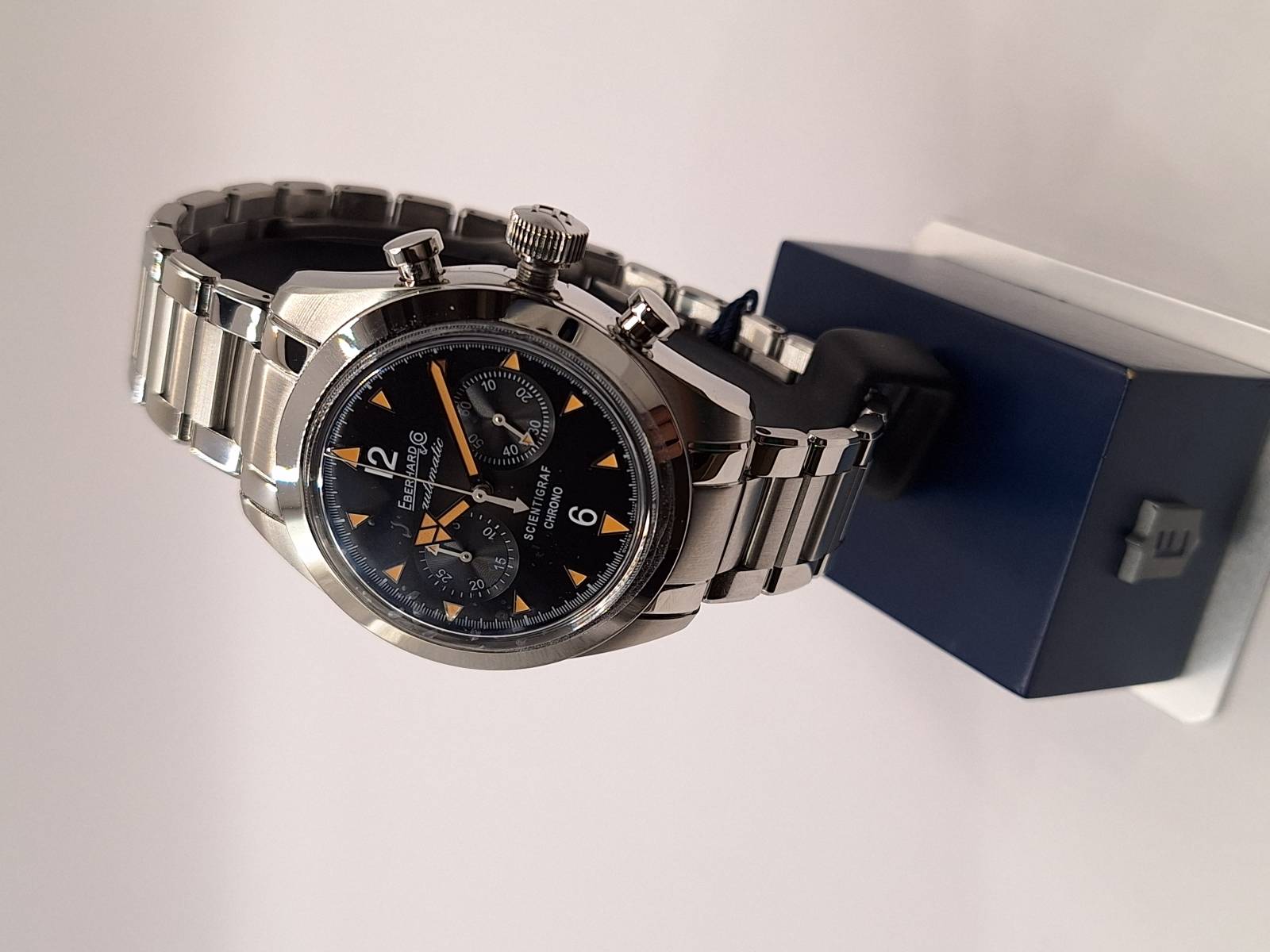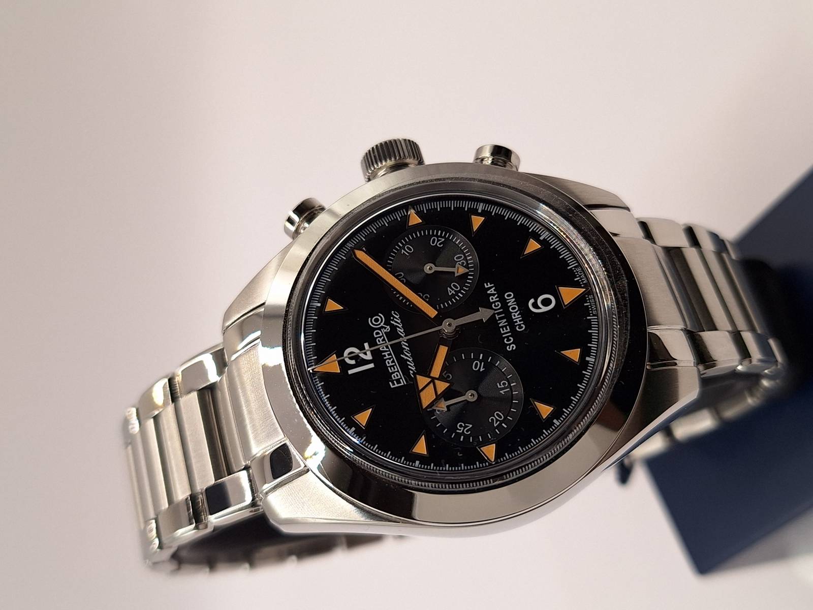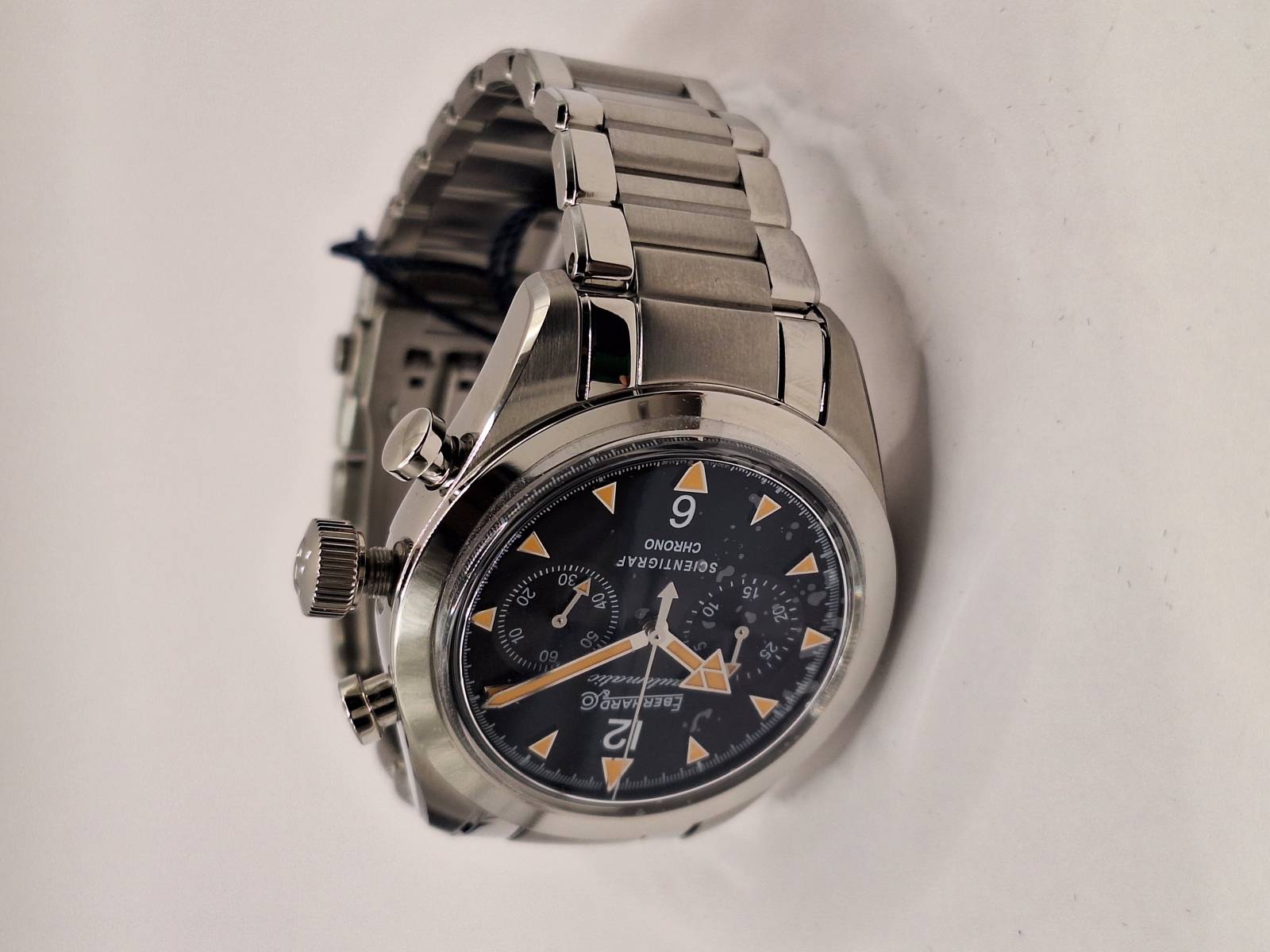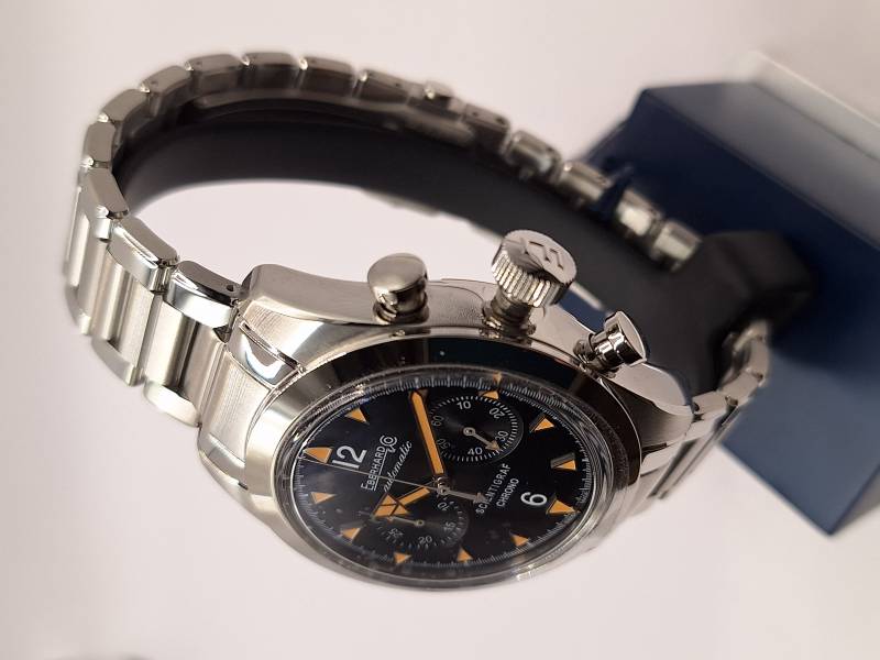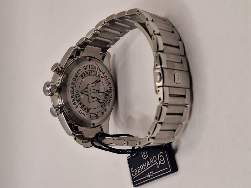 Orologio nuovo a carica automatica con indicazione di ore, minuti, secondi al centro, data panoramica e indicazione del giorno della settimana e della settimana dell'anno. Cassa in acciaio di mm 40 e spessore mm 13. Vetro zaffiro superiore e fondello in vetro zaffiro. Corona a pressione e impermeabilità a 5 bar. Calibro 100 di manifattura con rotore con particolari in oro 21 Kt