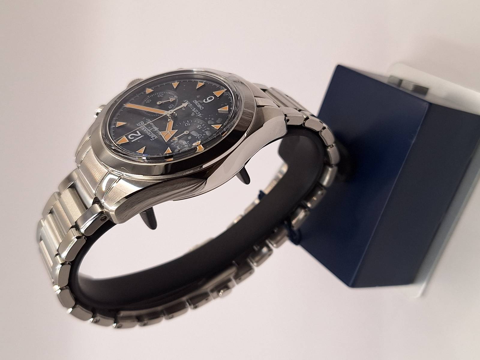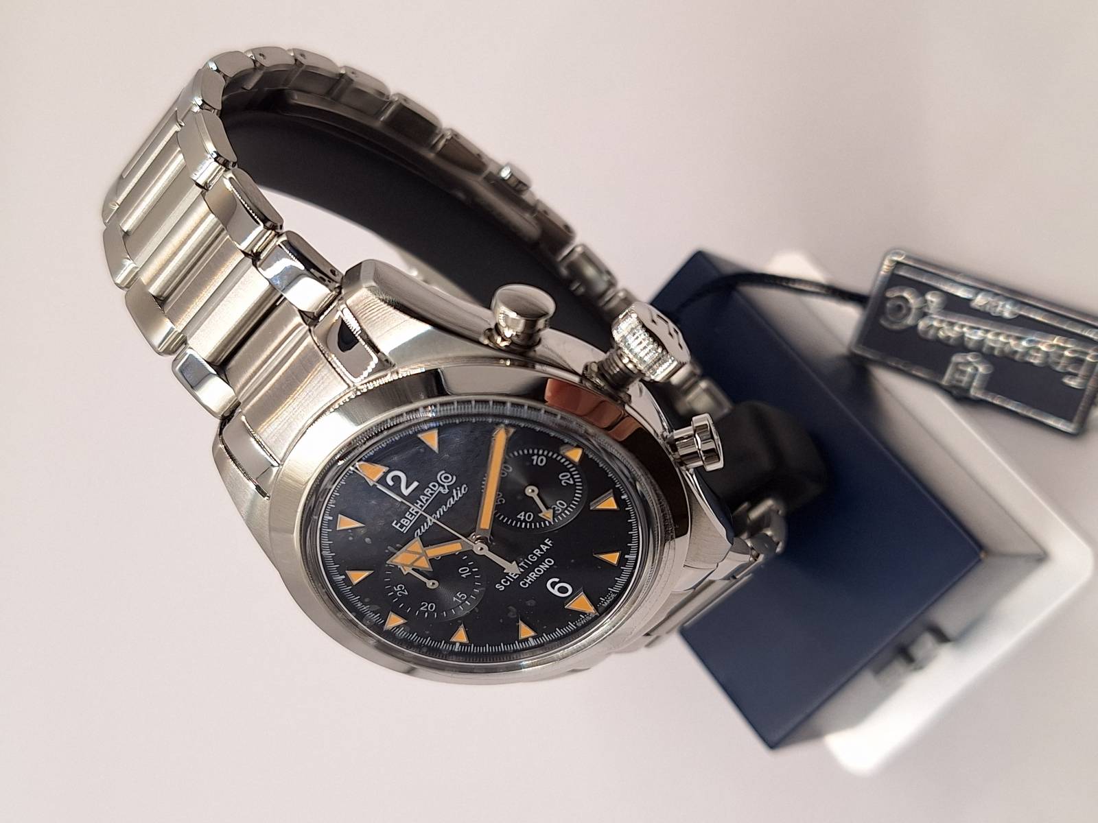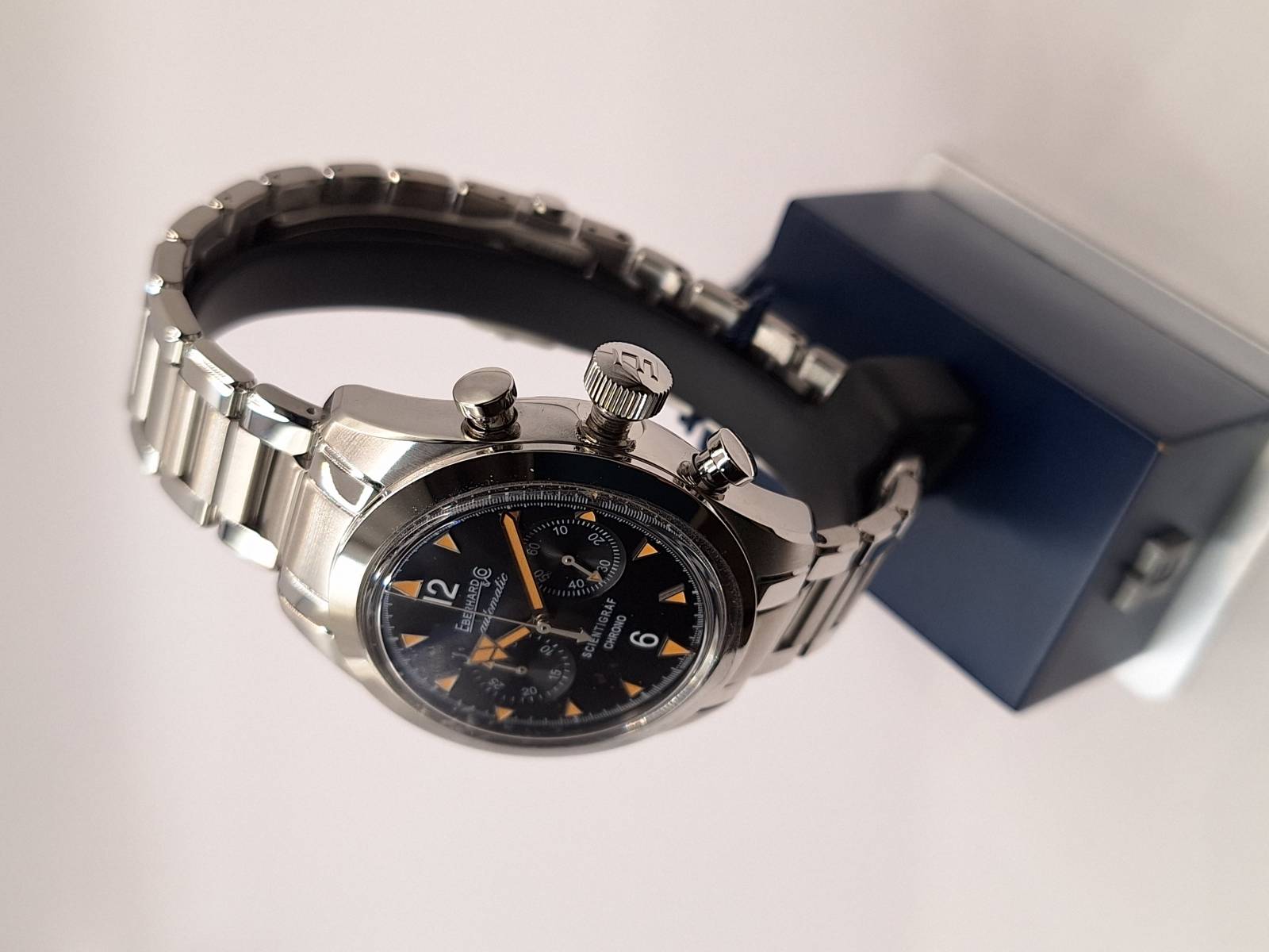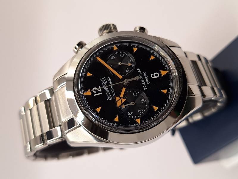 Orologio nuovo a carica automatica con indicazione di ore, minuti, secondi al centro, data panoramica e indicazione del giorno della settimana e della settimana dell'anno. Cassa in acciaio di mm 40 e spessore mm 13. Vetro zaffiro superiore e fondello in vetro zaffiro. Corona a pressione e impermeabilità a 5 bar. Calibro 100 di manifattura con rotore con particolari in oro 21 Kt