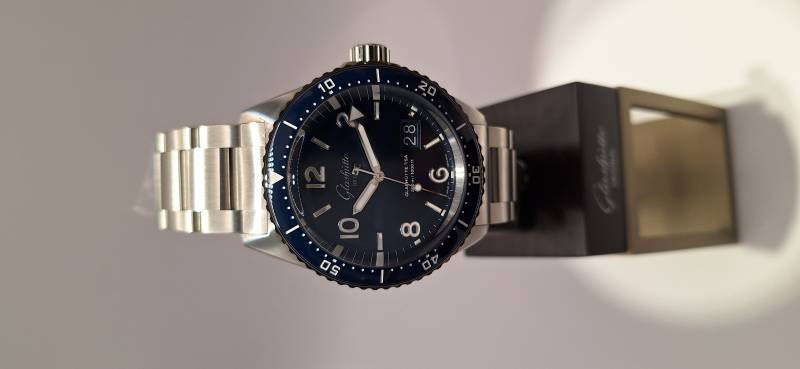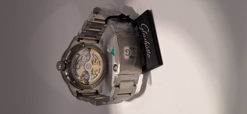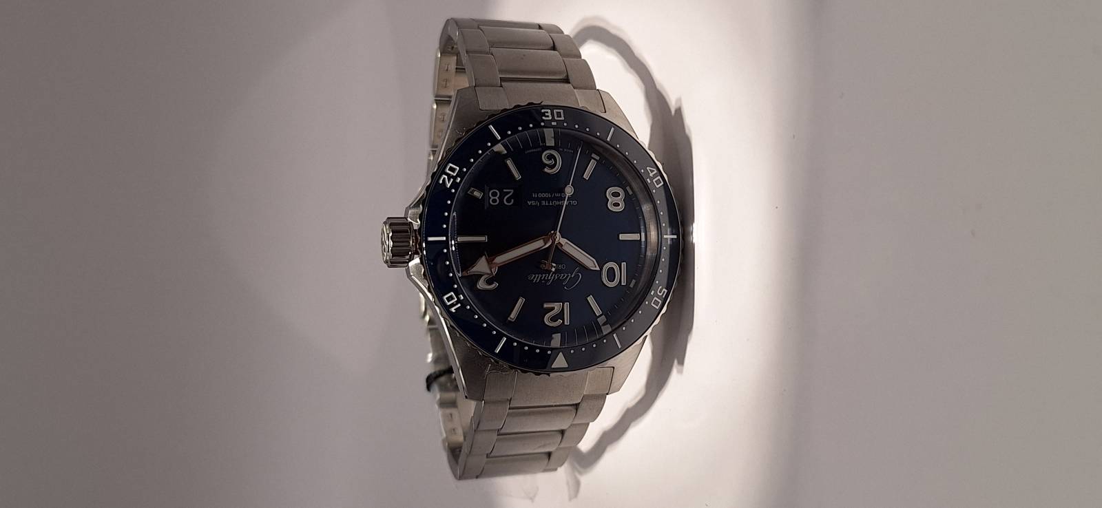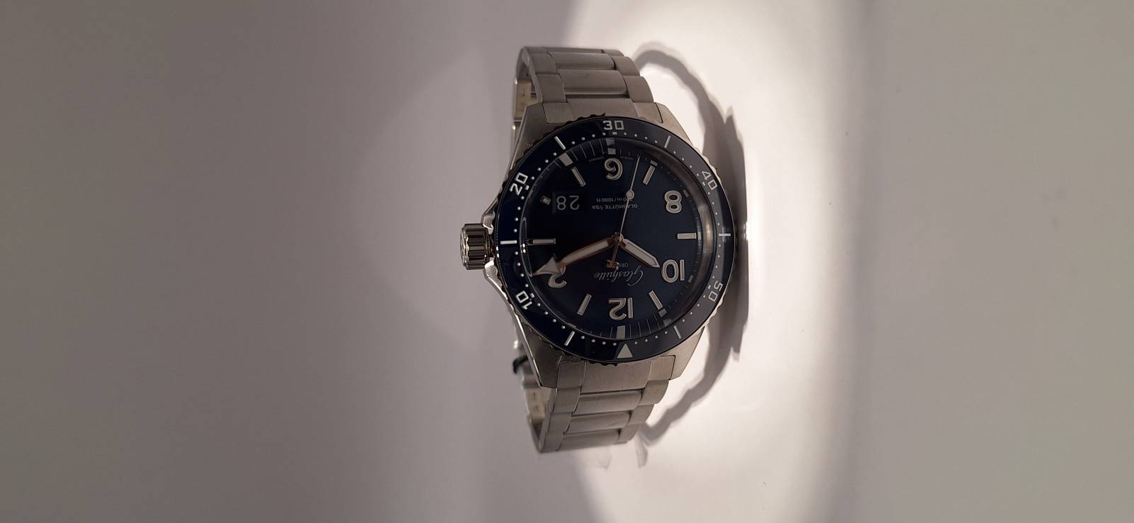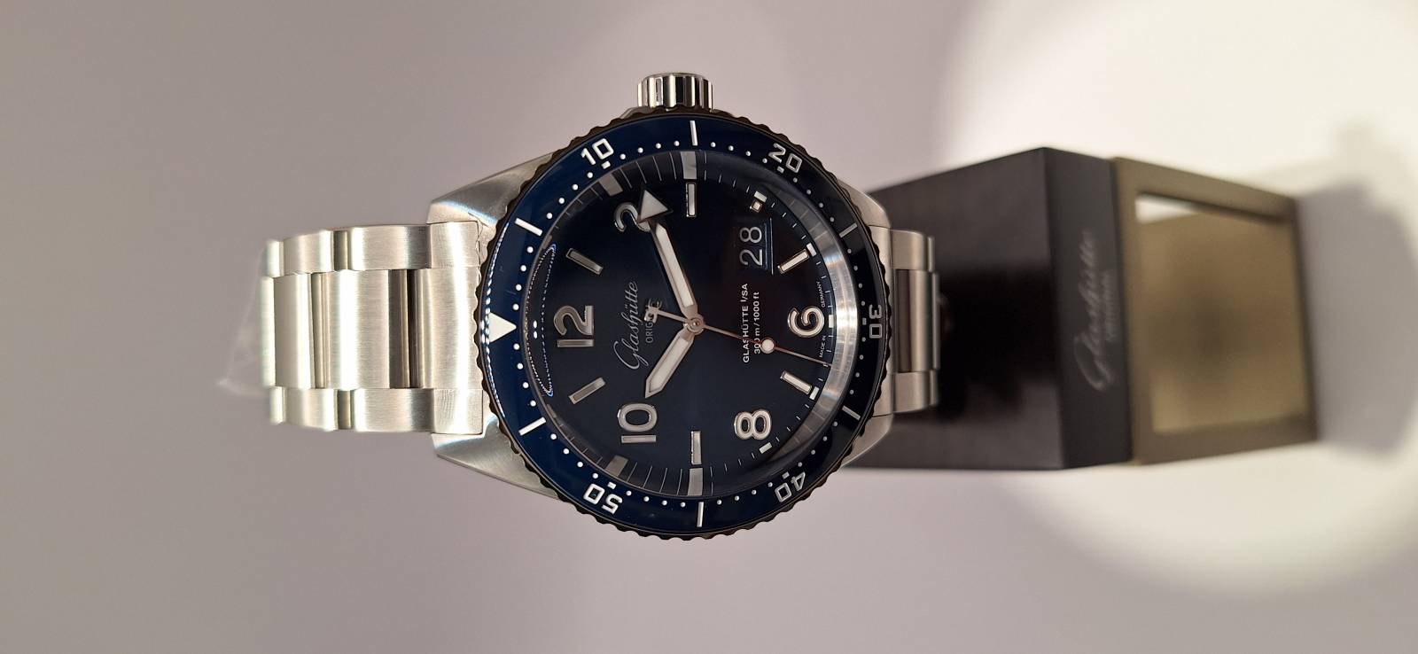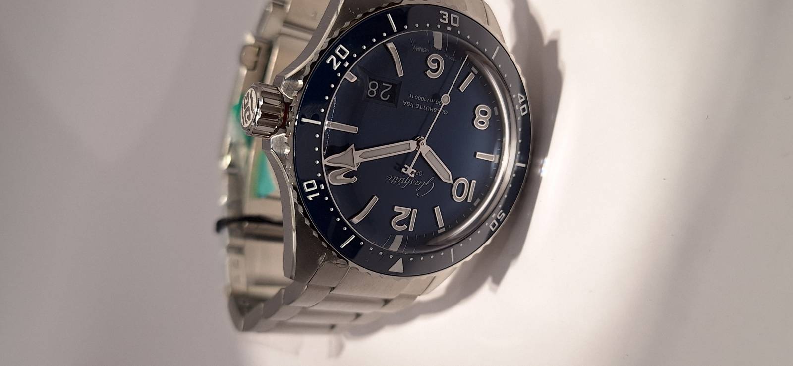 Orologio nuovo, carica automatica, data panoramica al 4, vetro zaffiro e fondello in vetro zaffiro, diametro cassa mm 43,2 e spessore mm 15,65, indici e lancette con Super-LumiNova, impermeabile a 30 bar, corona avvitata, fondello cassa avvitato, ghiera girevole per i tempi di immersione in acciaio e ceramica, calibro di manifattura 36-13 con rotore con applicazioni in oro 21kt