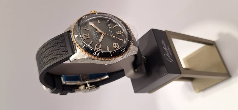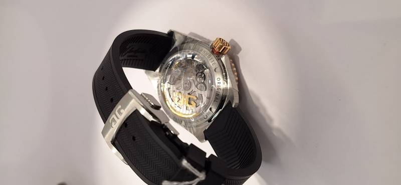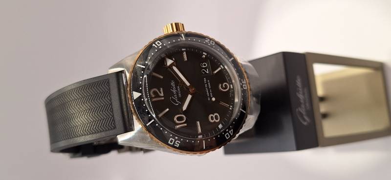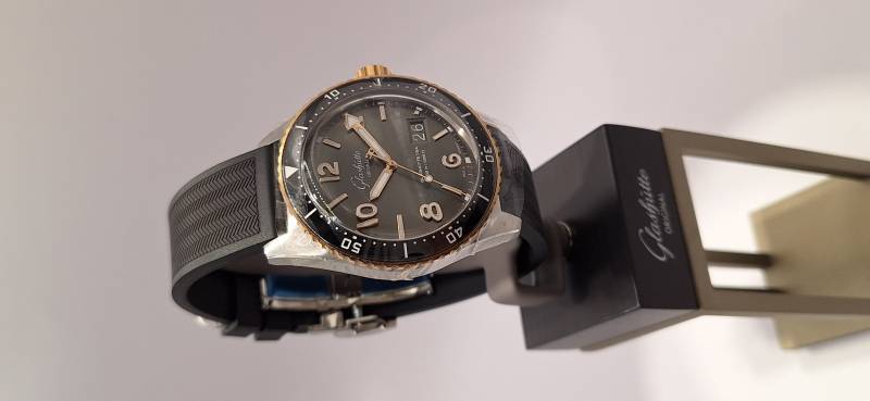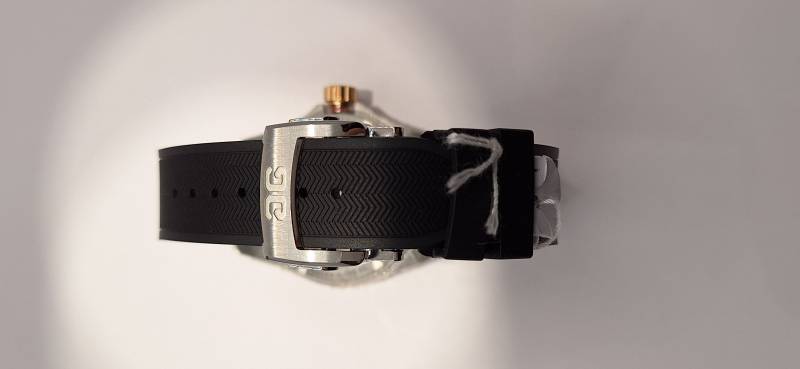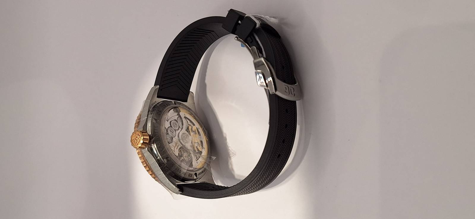 Orologio nuovo, carica automatica, data panoramica al 4, vetro zaffiro e fondello in vetro zaffiro, diametro cassa, 43,2 e spessore mm  15,65, indici e lancette con Super-LumiNova,impermeabile a 30 bar, corona a vite e fondello avvitato, ghiera girevole per i temopi di immersione in acciaio e ceramica