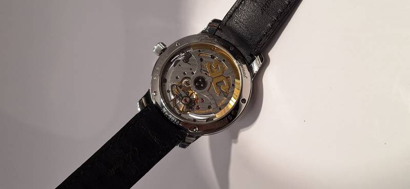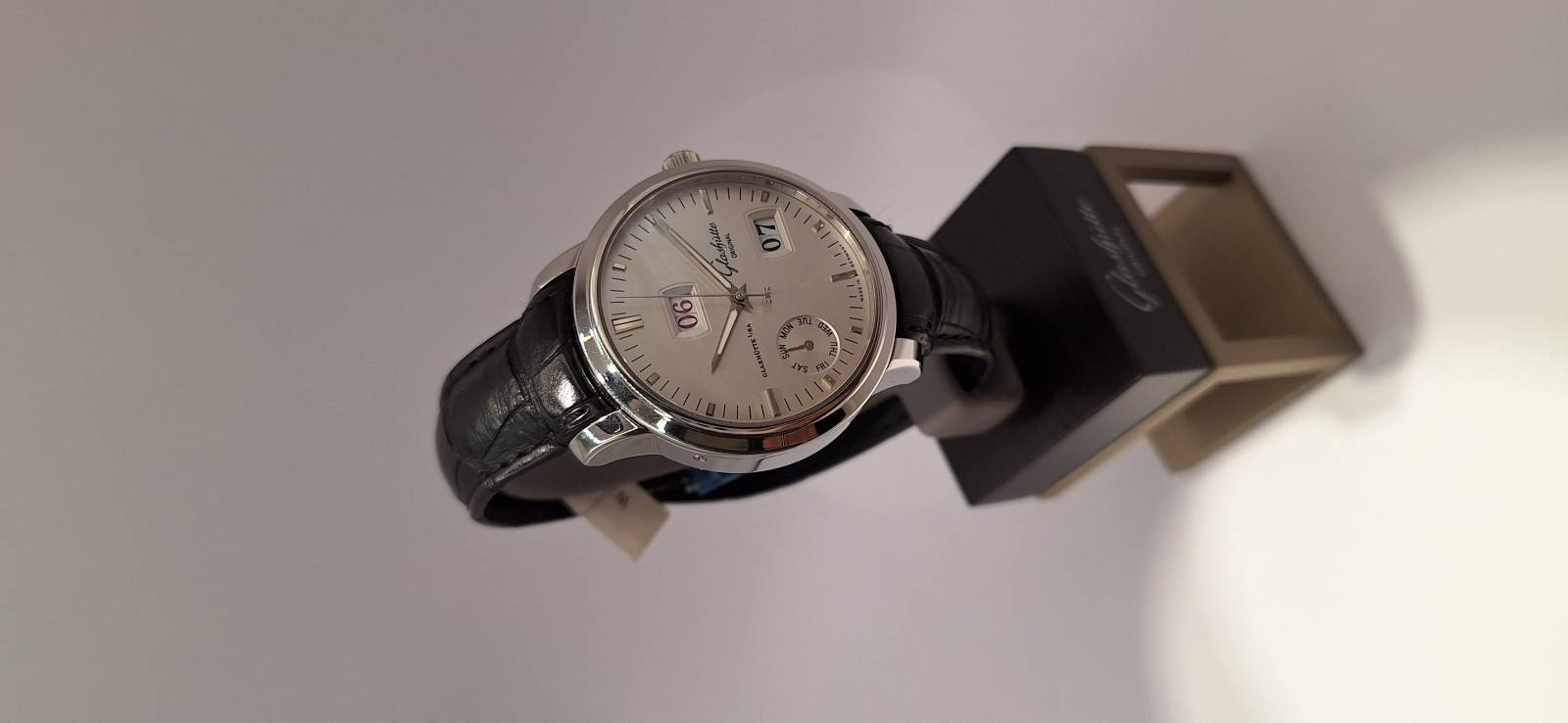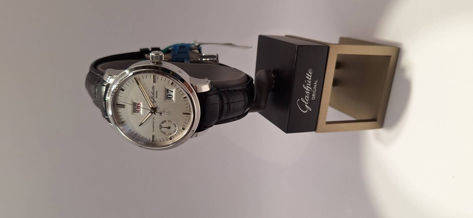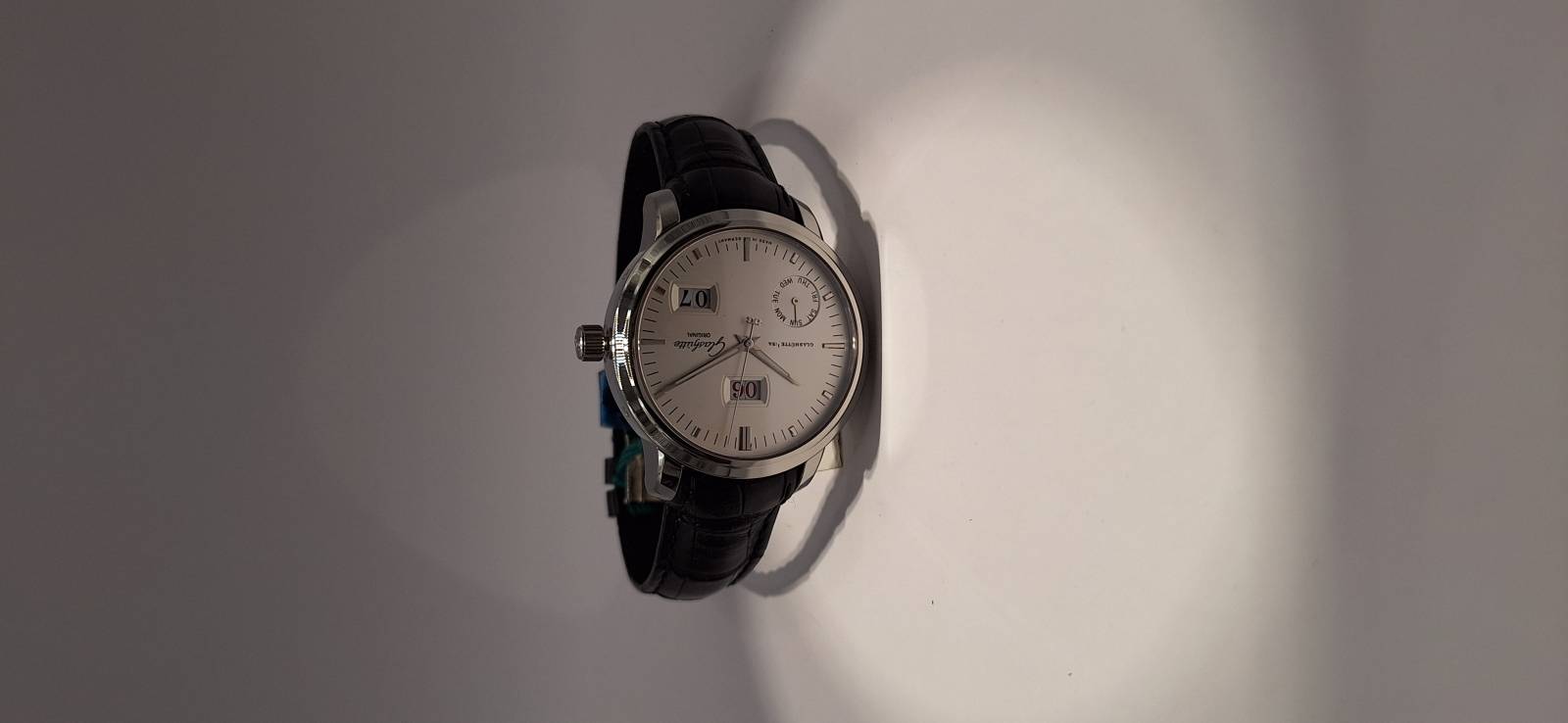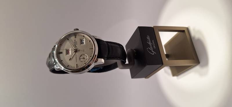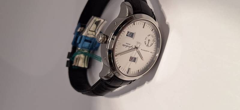 Orologio nuovo con cronografo, data e quattro contatori allineati che indicano i secondi indipendenti, il totalizzatore dei minuti, il totalizzatore delle ore e le 24 h dell'orologio. Cassa in acciaio diametro 42 mm e spessore mm 13,5, bracciale in acciaio Chaque, vetro zaffiro superiore con trattamento antiriflesso e fondello fermato da sei viti con incisione 21-42. Corona a vite con finitura in ceramica e pulsanti a pressione.impermeabilità a 50 metri.