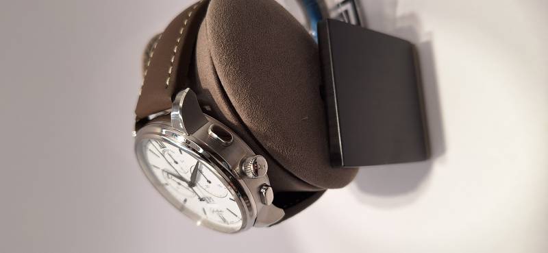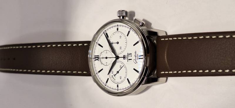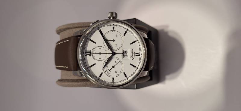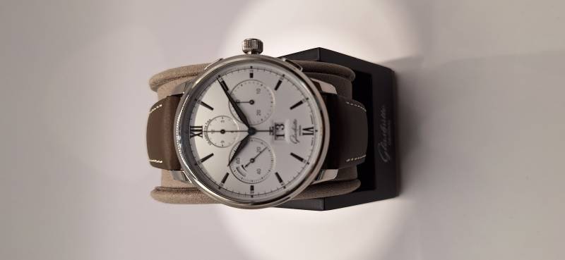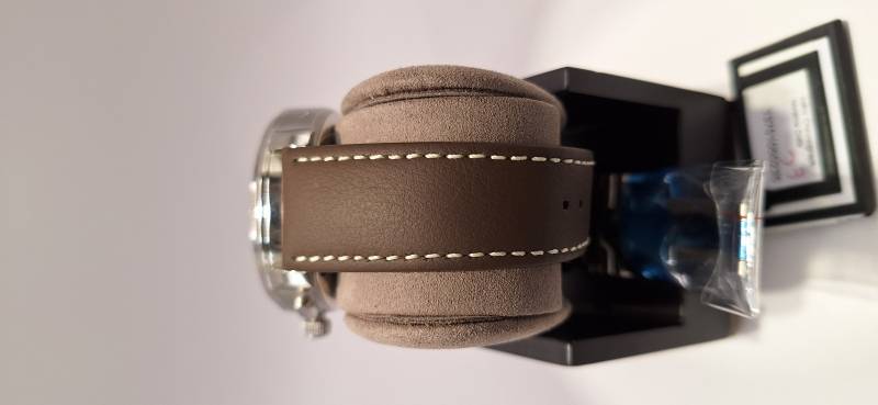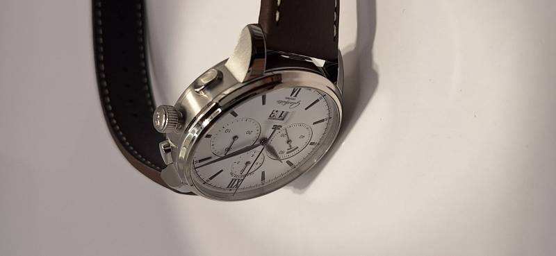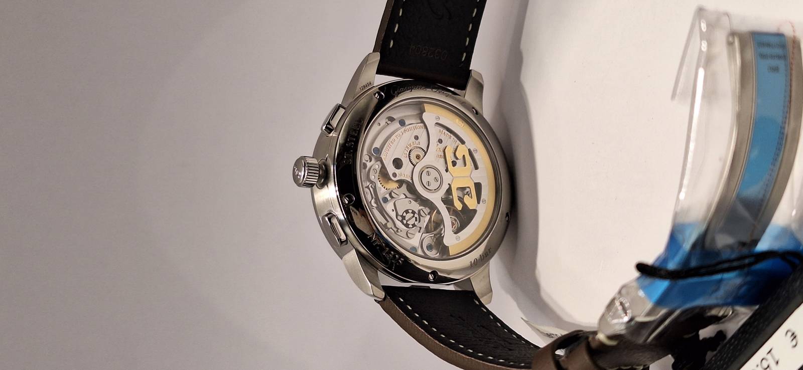 Orologio nuovo a carica automatica, cronografo con totalizzatori minuti e ore, data panoramica, indicazione della riserva di marcia, corona a vite e pulsanti a pressione. Vetro zaffiro superiore e fondello in vetro zaffiro. Cassa in acciaio diametro 42 mm e spessore mm 14,6. Movimento di manifattura cal. 37-01 con rotore con applicazioni in oro 21 Kt.