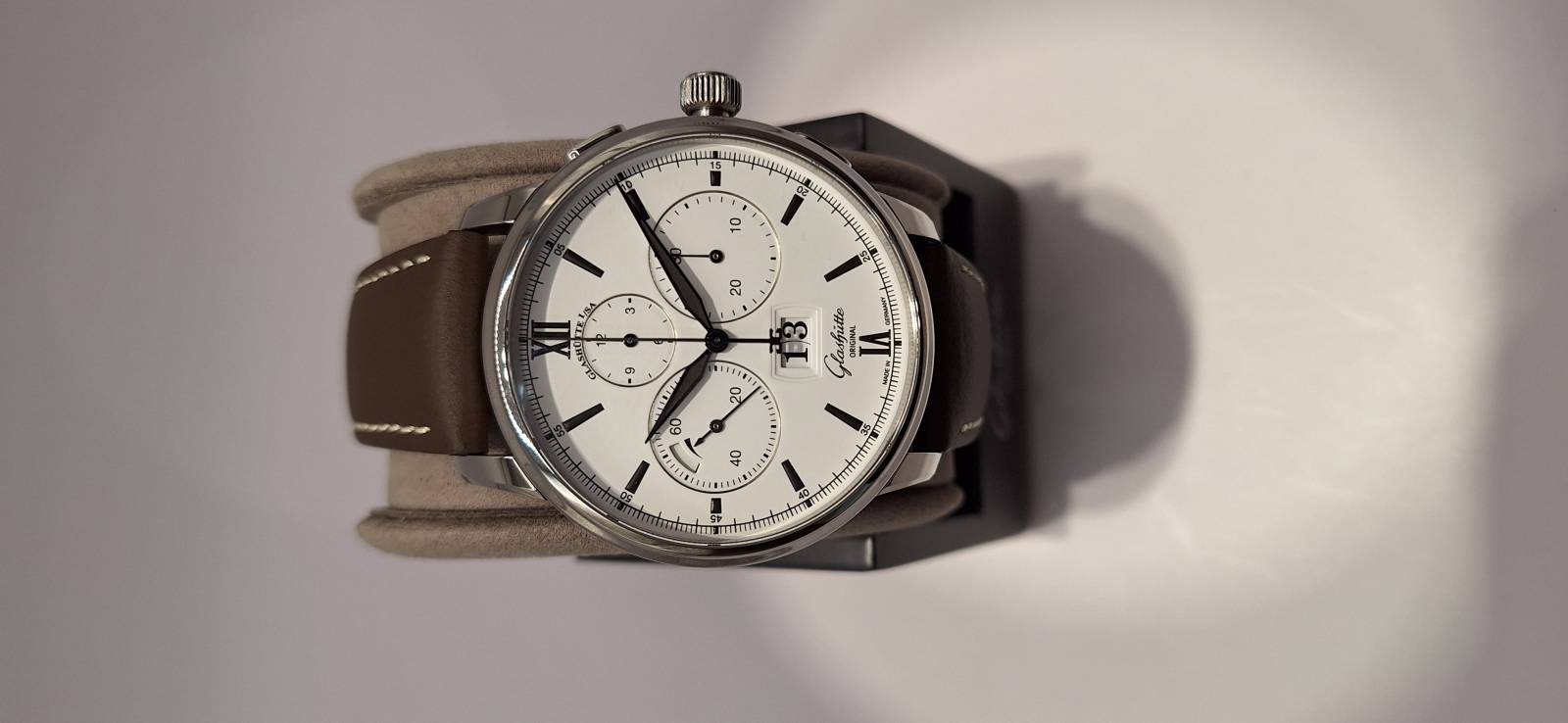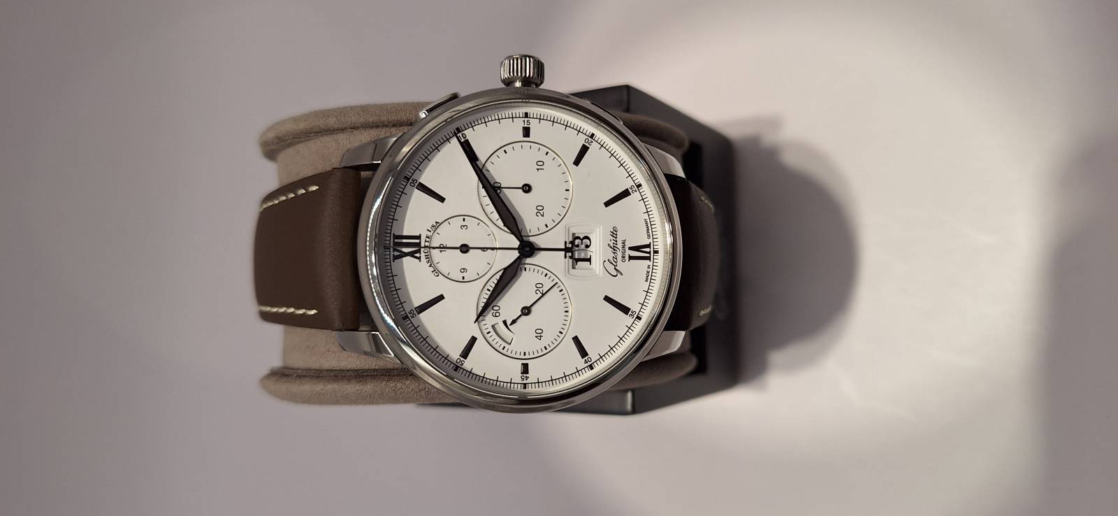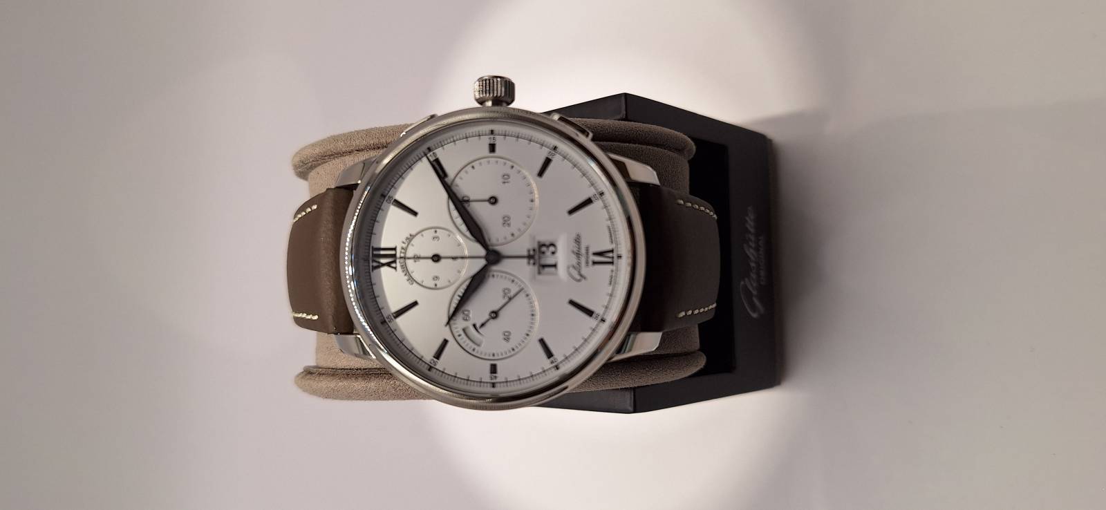 Orologio nuovo a carica automatica, cronografo con totalizzatori minuti e ore, data panoramica, indicazione della riserva di marcia, corona a vite e pulsanti a pressione. Vetro zaffiro superiore e fondello in vetro zaffiro. Cassa in acciaio diametro 42 mm e spessore mm 14,6. Movimento di manifattura cal. 37-01 con rotore con applicazioni in oro 21 Kt.
