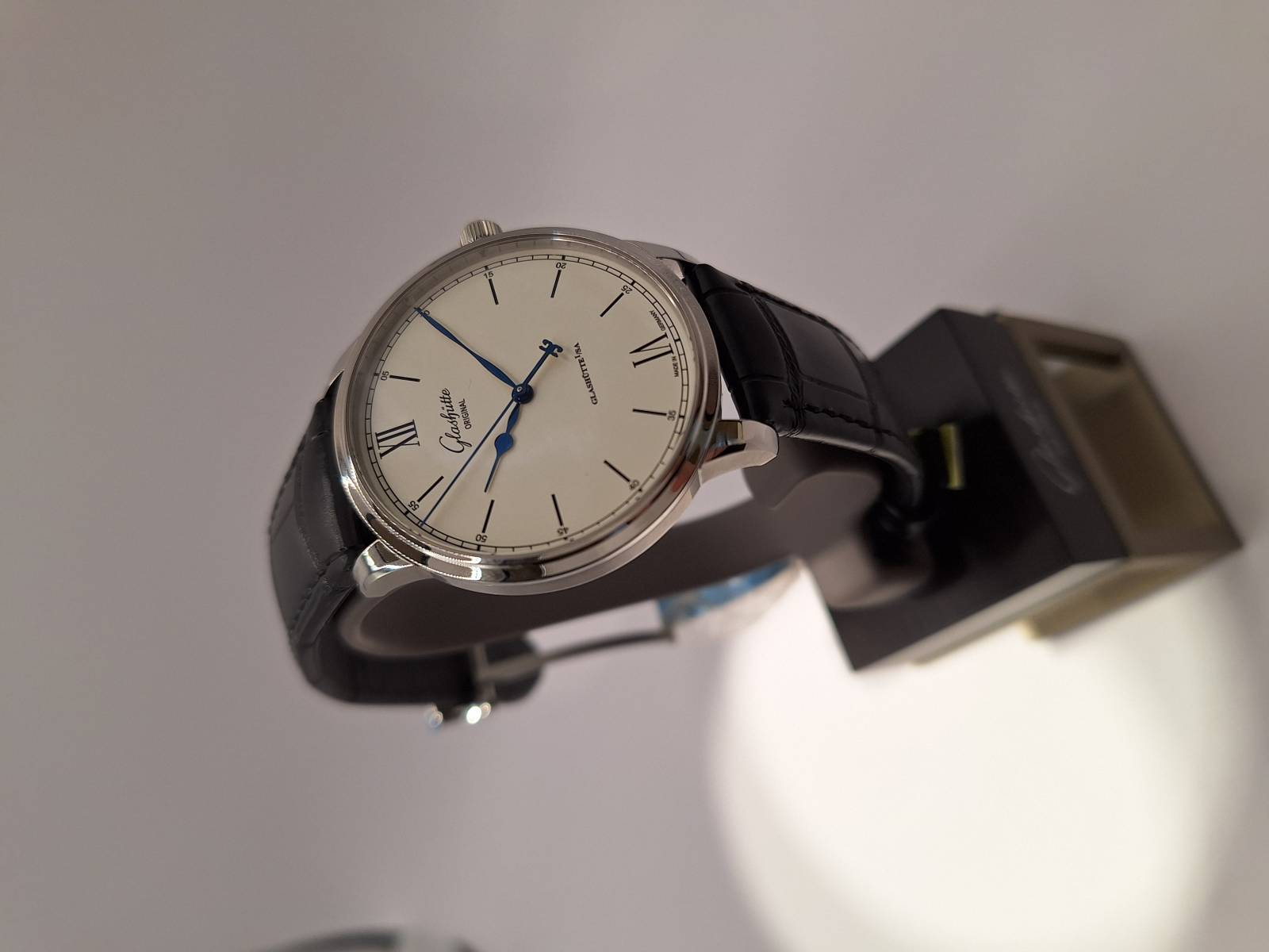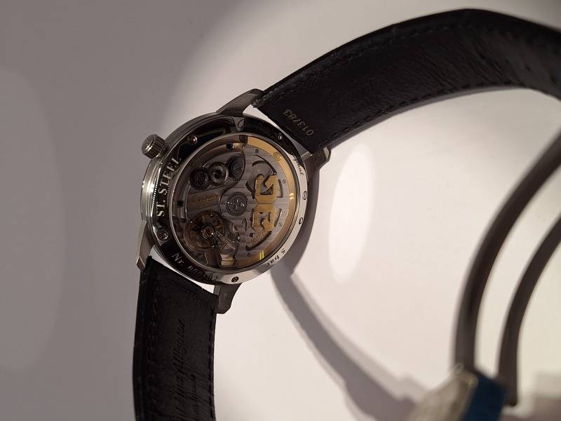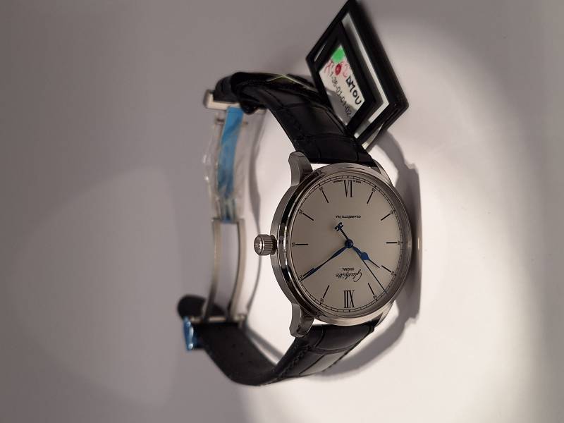 Orologio nuovo a carica automatica, mindicazione ore e minuti e secondi al centro. Cassa in acciaio di mm 40 e spessore mm 10. Vetro zaffiro superiore e fondello in vetro zaffiro. Movimento di manifattura cal 36-01 con 100 h di riserva di carica. Rotore con applicazioni in oro 21 Kt