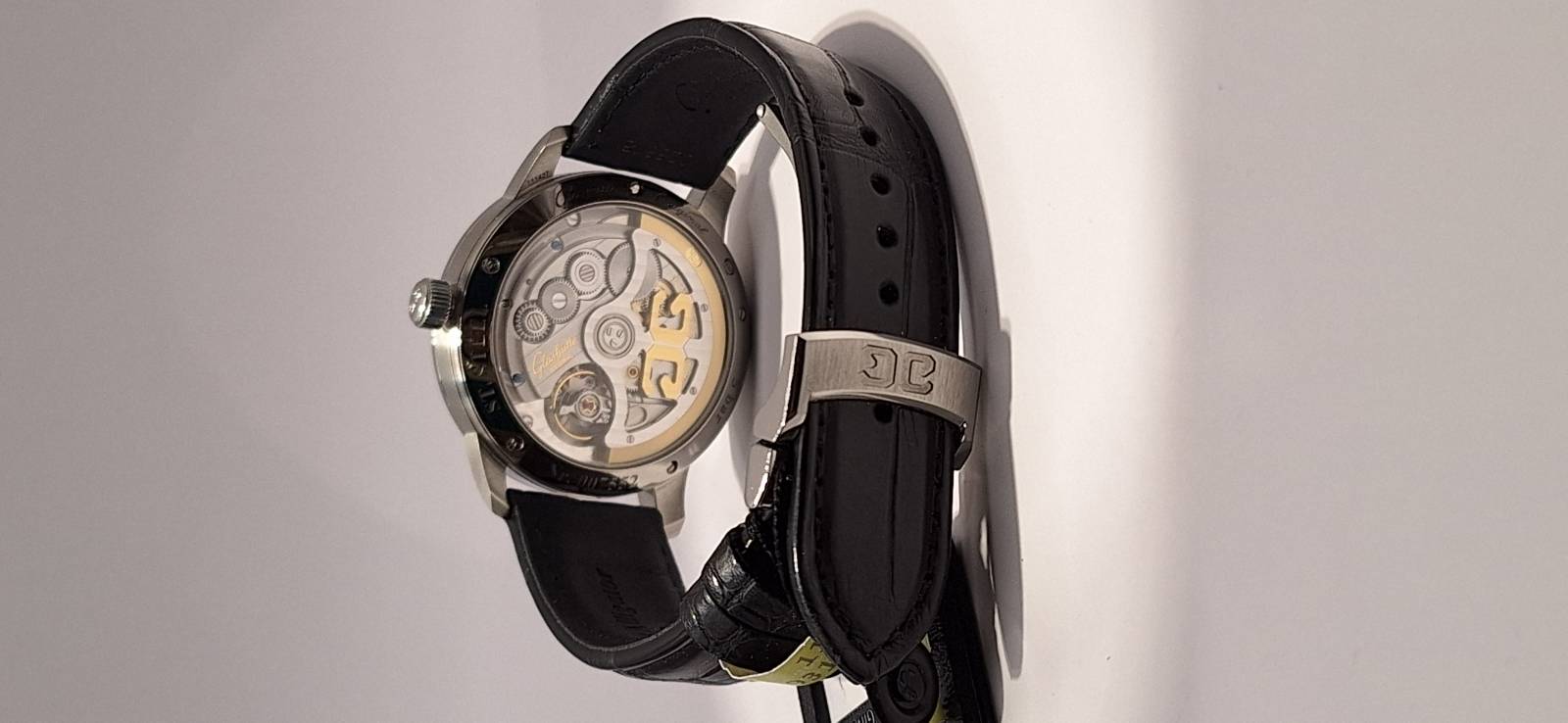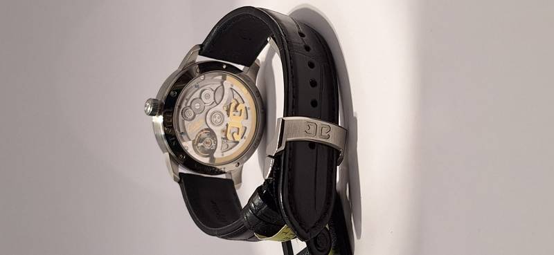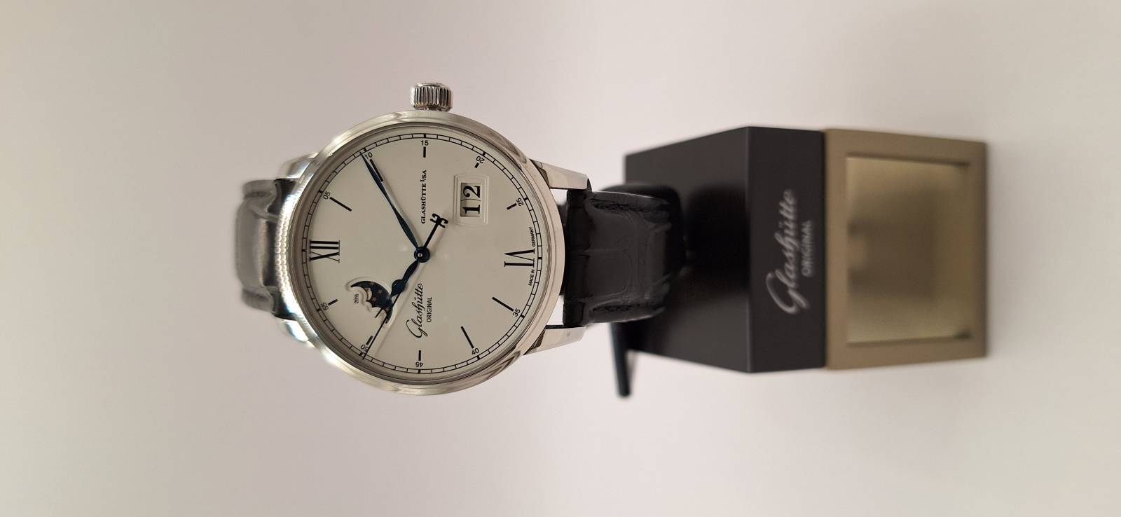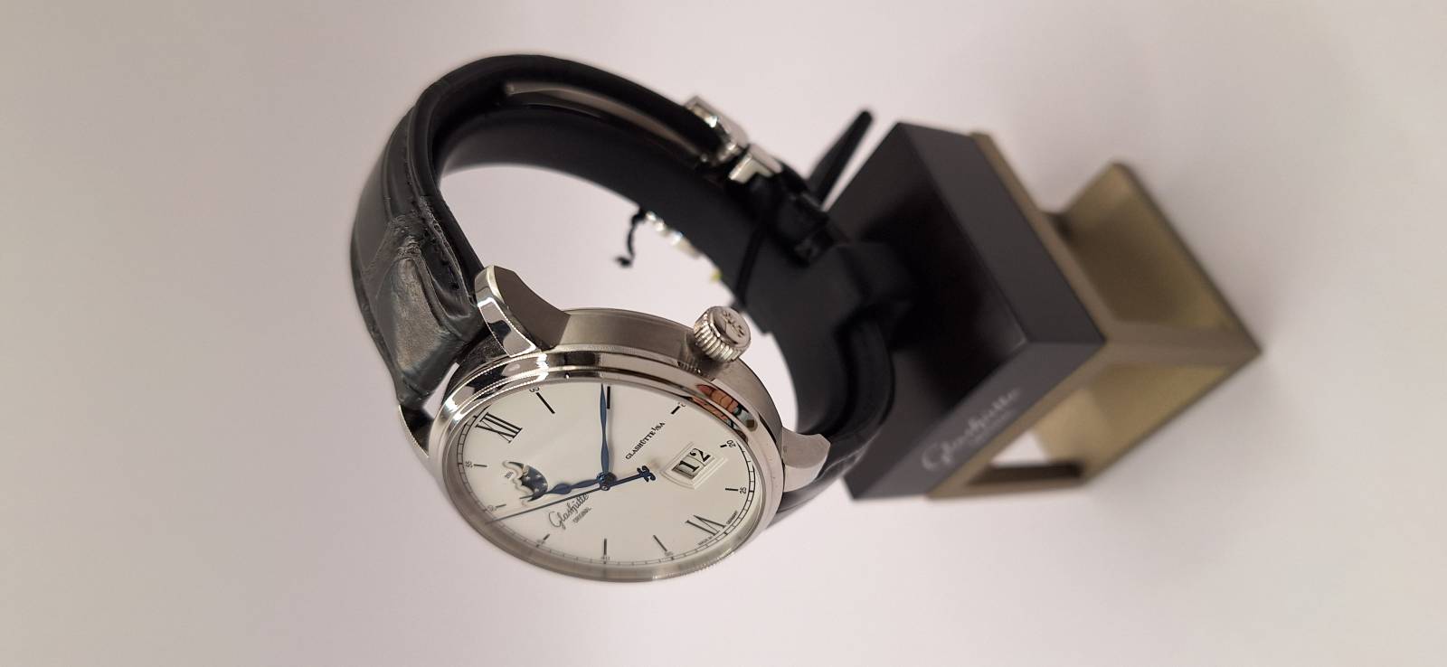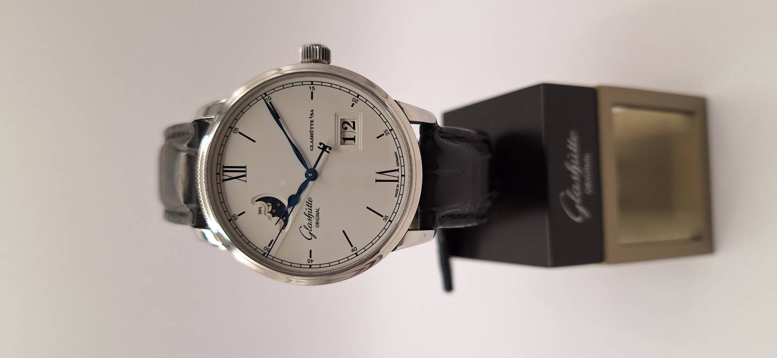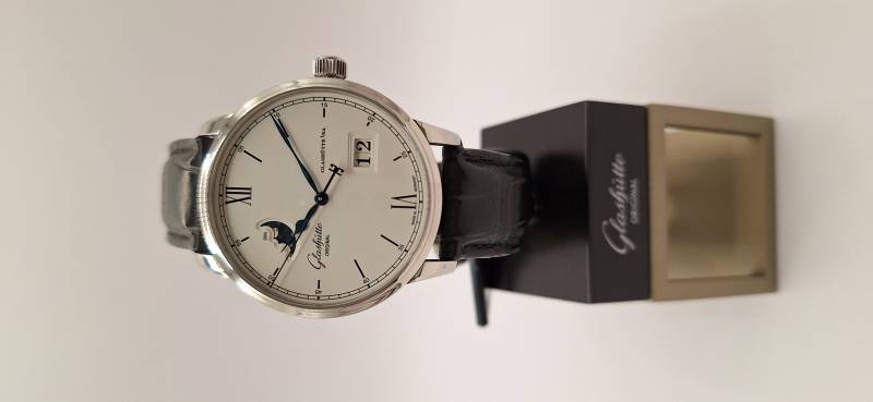 Orologio nuovo a carica automatica con indicazione di ore, minuti, secondi al centro, fasi di luna e data panoramica. Cassa in acciaio diametro mm 40 e spessore mm 12,2. Vetro zaffiro superiore e fondello in vetro zaffiro. Riserva di carica di 100 h e impermeabilità a 5 bar. Movimento di manifattura 36-04 con rotore con applicazioni in oro 21 Kt