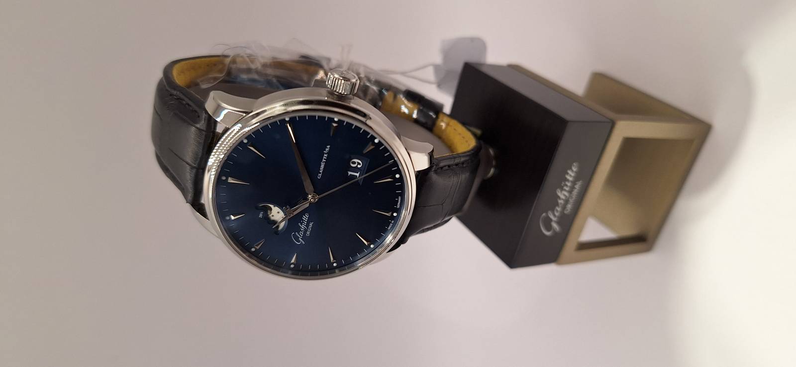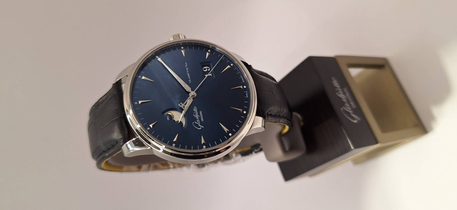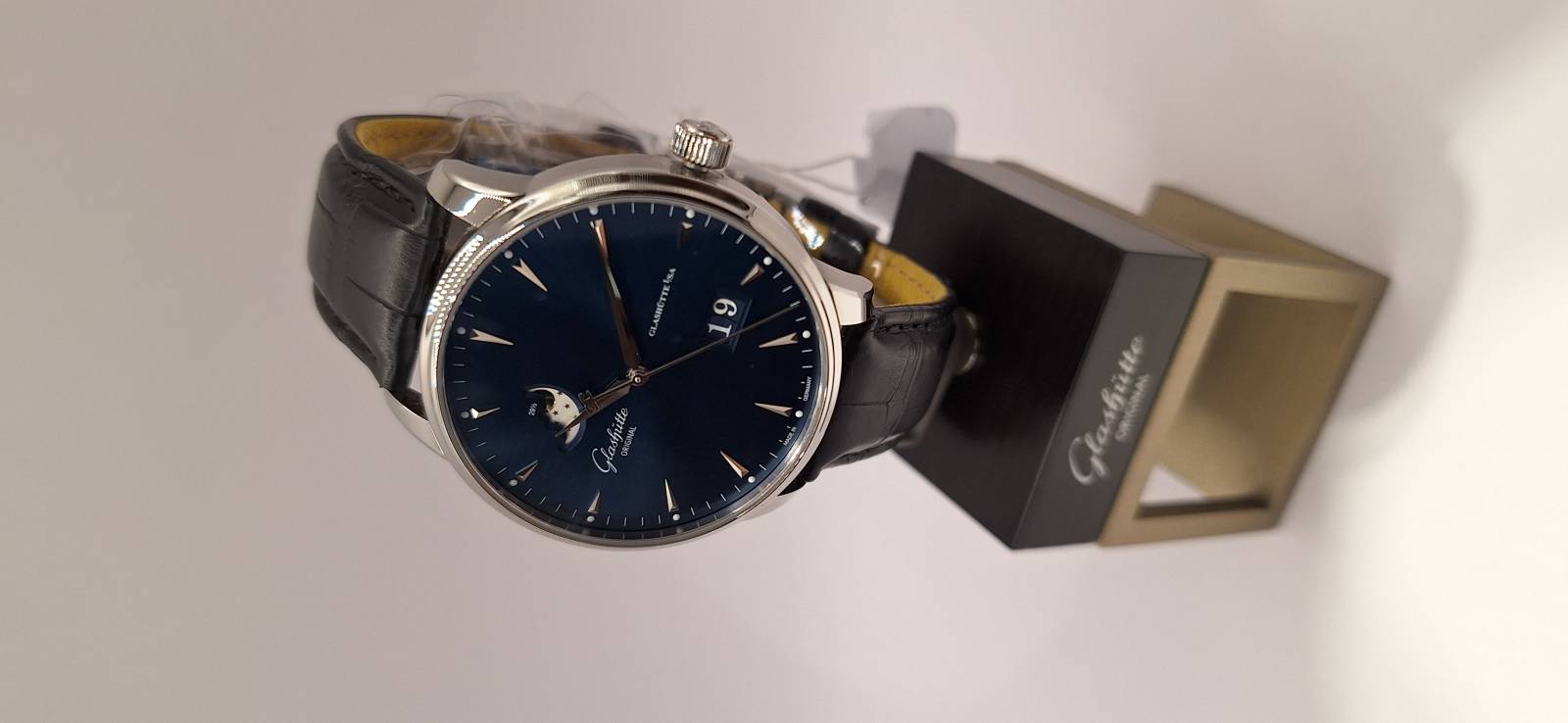 Orologio nuovo a carica automatica con indicazione di ore, minuti, secondi al centro, data panoramica e fasi di luna. Cassa in acciaio diametro mm 42 e spessore mm 12,2.
