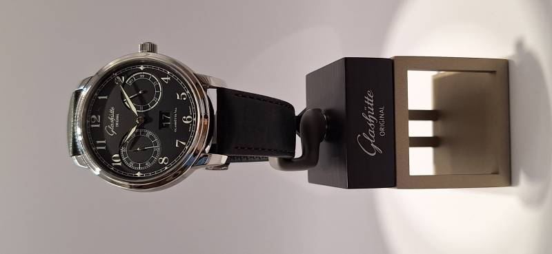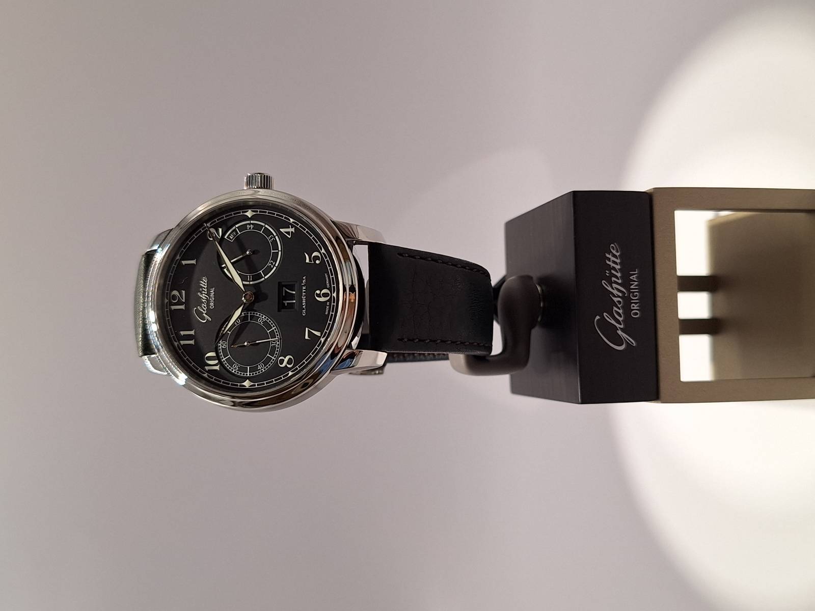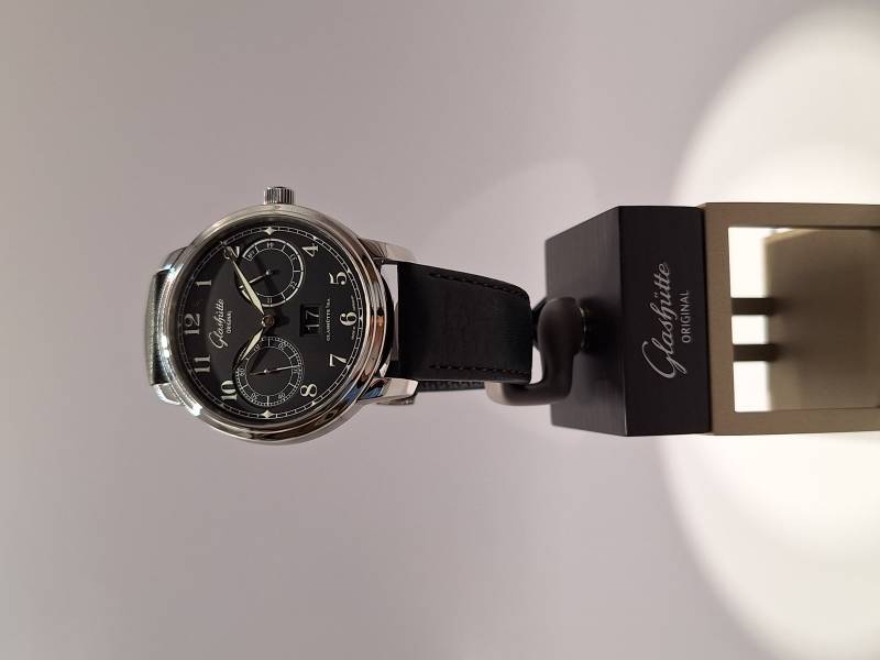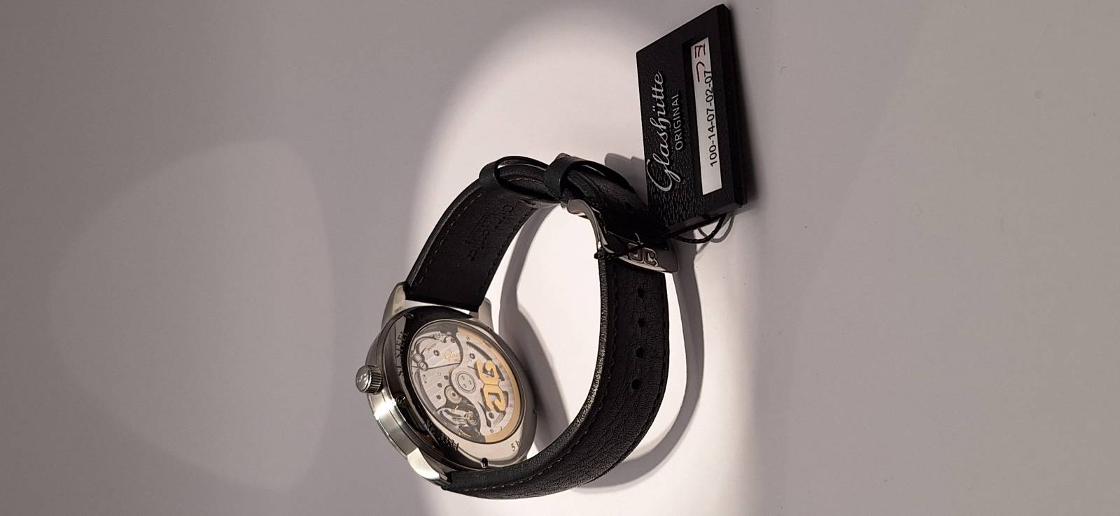 Orologio nuovo a carica automatica con indicazione di ore e minuti, piccoli secondi al 9 e indicazione della riserva di carica al 3. Data panoramica, vetro zaffiro superi0ore e fondello in vetro zaffiro. Cassa in acciaio diametro 44 mm espessore mm 12. Corona a pressione e impermeabilità a 5 bar. Movimento di manifattura cal. 100-14 con rotore con applicazioni in oro 21 Kt