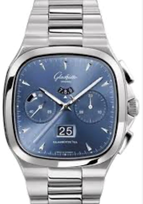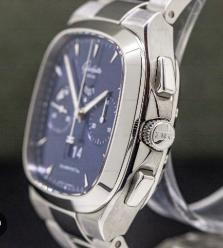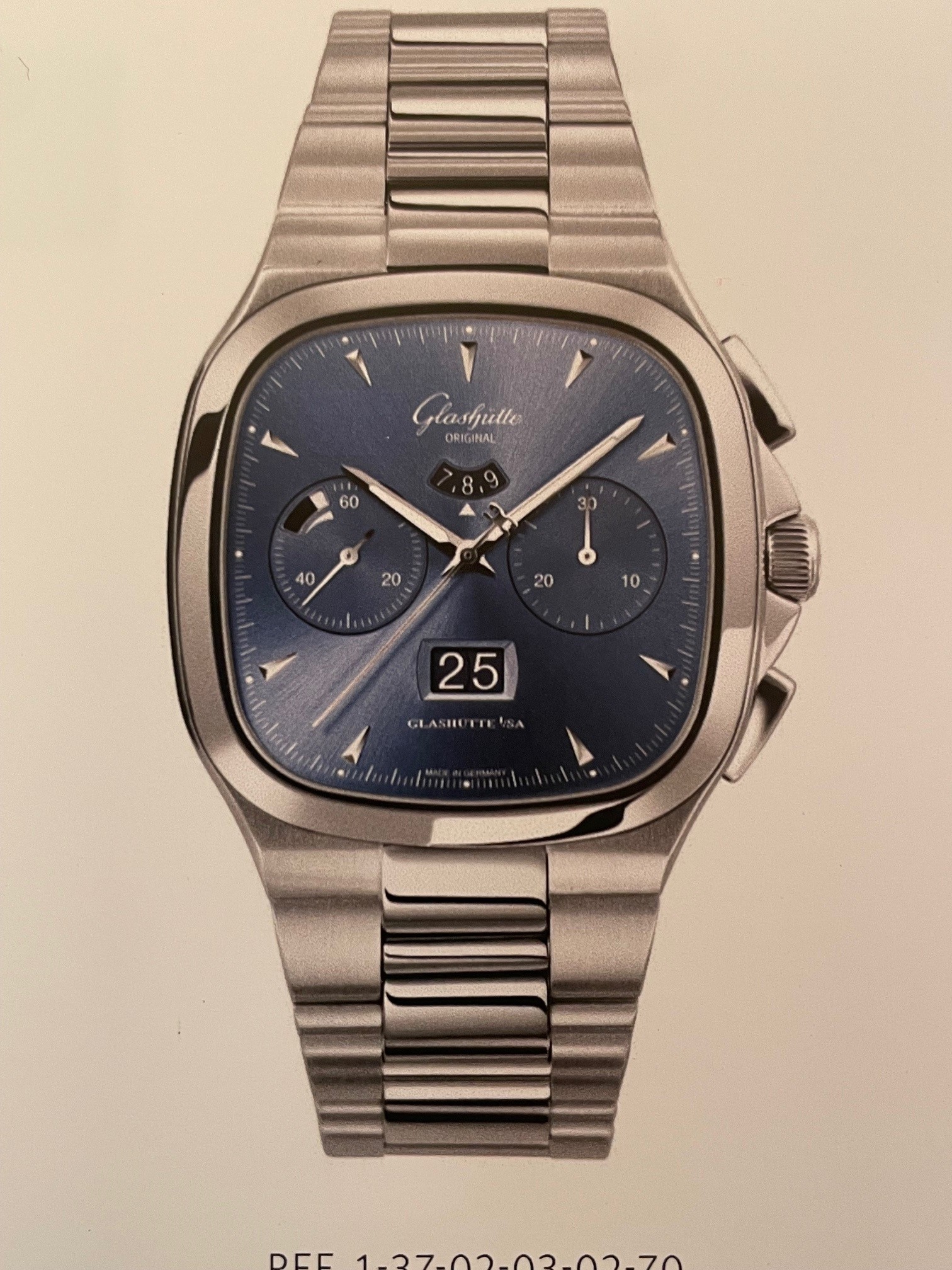 Orologio nuovo; carica automatica; data pananoramica; cronografo con indicazione ore, minuti, secondi; indicazione ore cronografo con finestrella digitale; indicazione della riserva di carica; corona a vite; pulsanti cronografo a pressione; vetro zaffiro superiore e fondello in vetro zaffiro; rotore con applicazioni in oro 21 Kt; misure cassa 40mm x 40mm; altezza mm 14,10; movimento di manifattura cal 37-02
