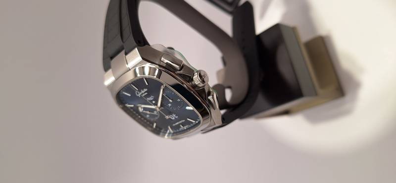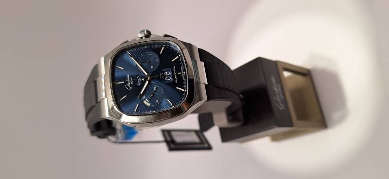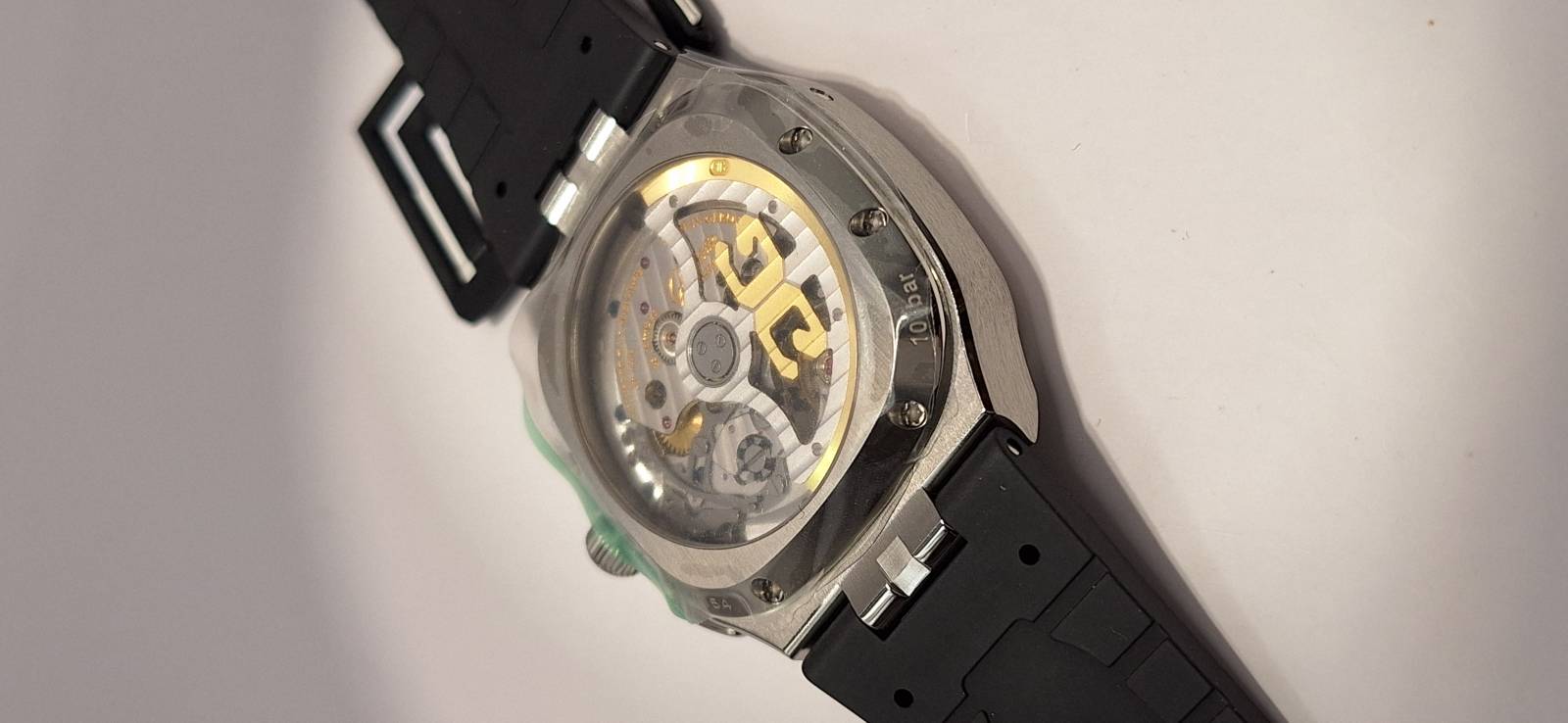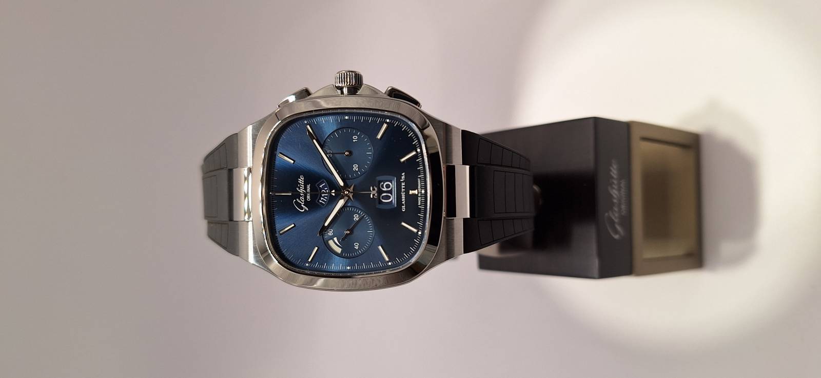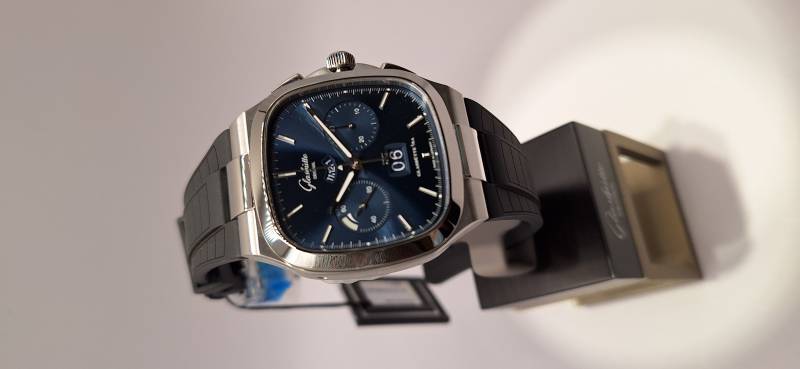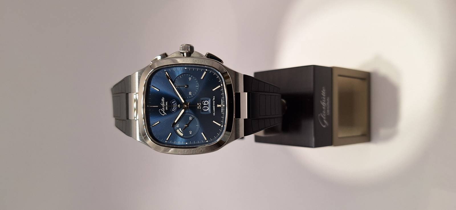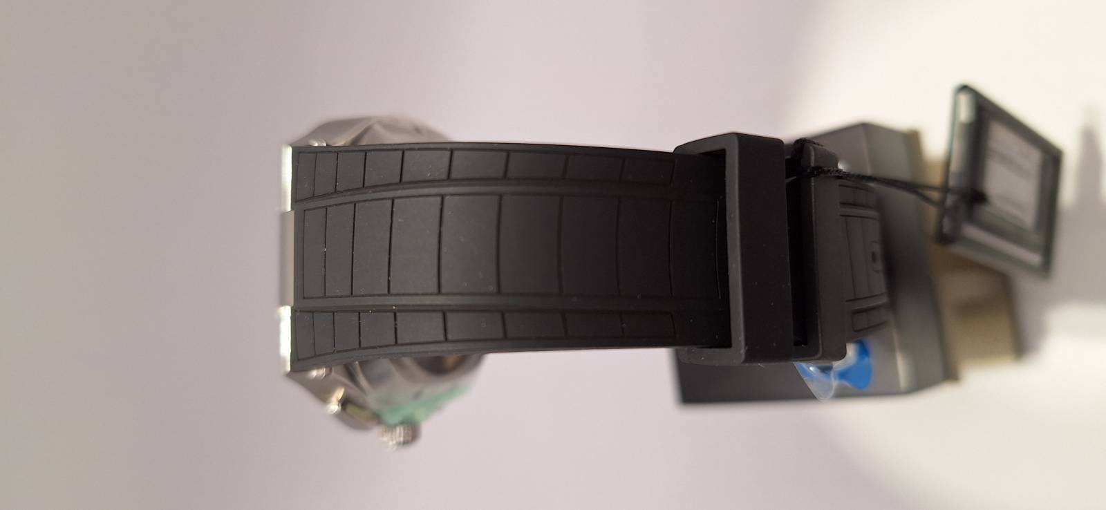 Orologio nuovo, carica automatica,data panoramica, cronografo con indicazione ore, minuti,secondi, indicazione ore cronografo con finestrella digitale, indicazione della riserva di carica,corona a vite e fondello avvitato, pulanti cronografo a pressione, vetro zaffiro superiore e fondello in vetro zaffiro, rotore con applicazioni in oro 21 Kt