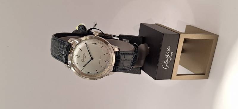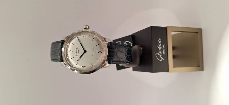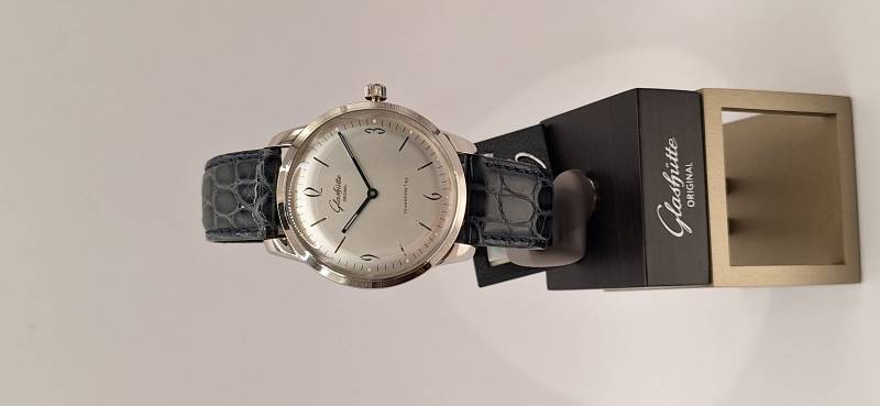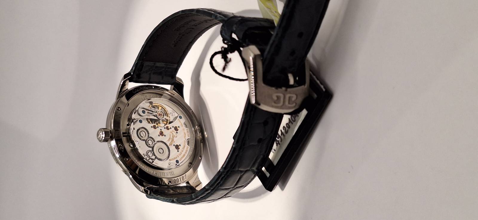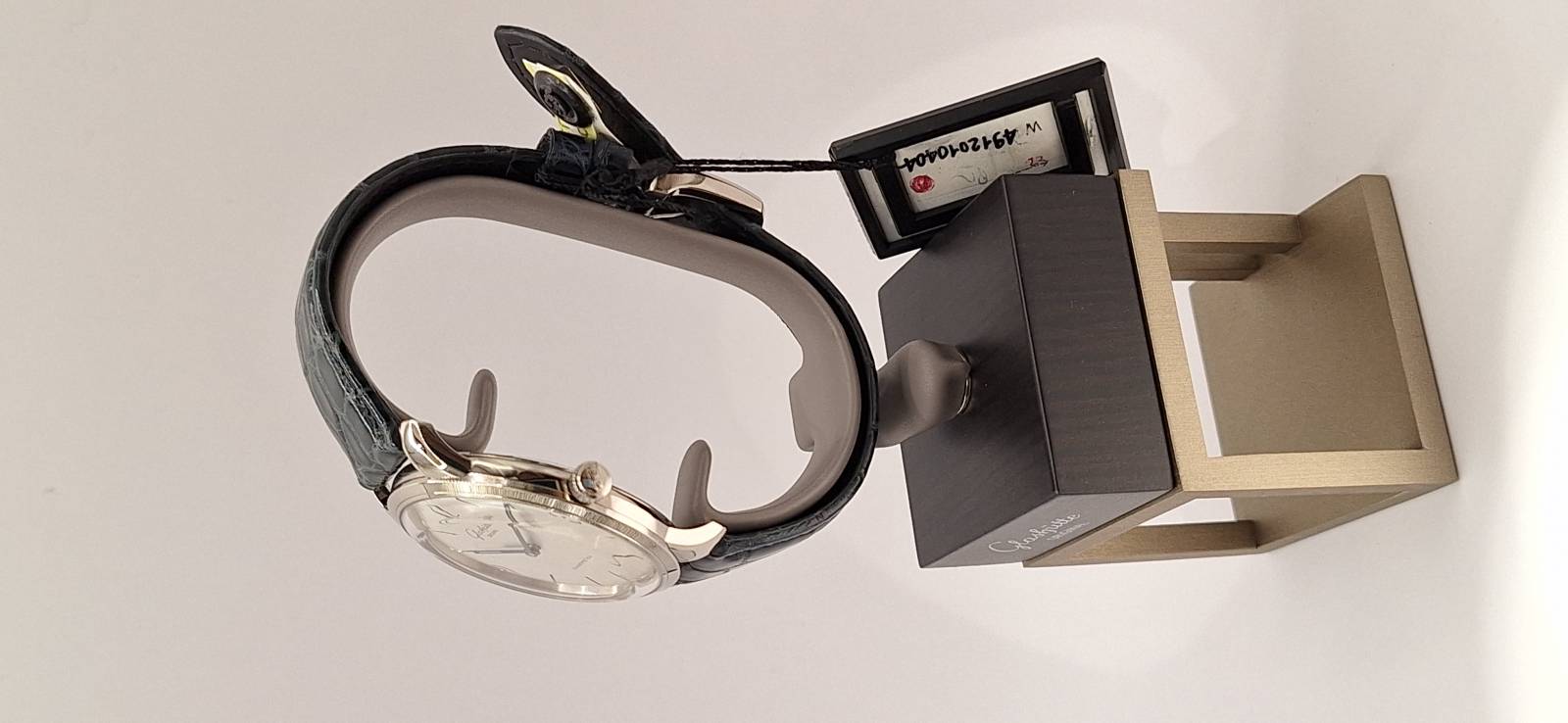 Orologio a carica manuale con indicazione di ore e minuti, vetro zaffiro superiore e fondello in vetro zaffiro, movimento calibro 49 con regolazione a collo di cigno, diametro cassa 39 mm e spessore 9,8 mm