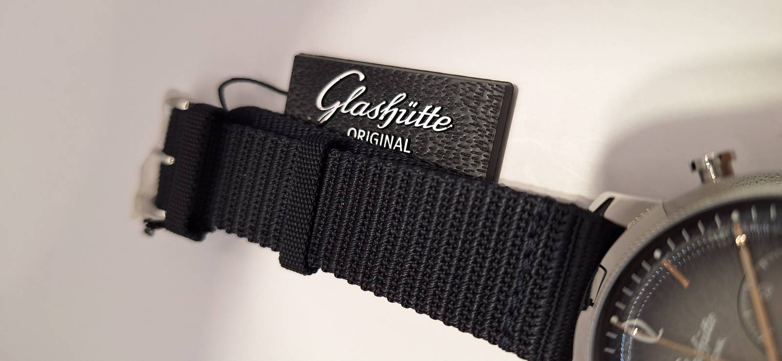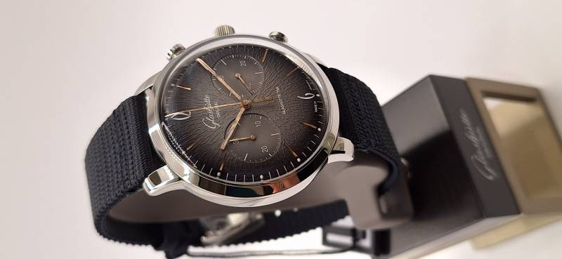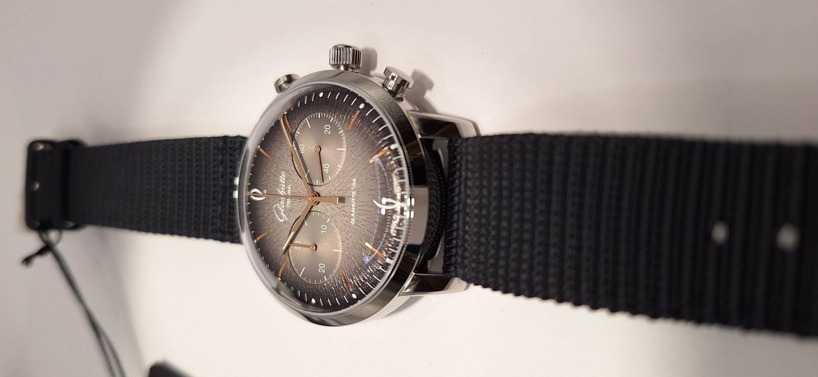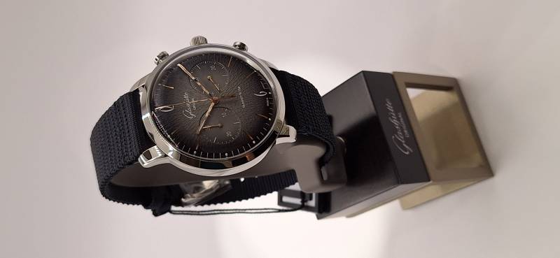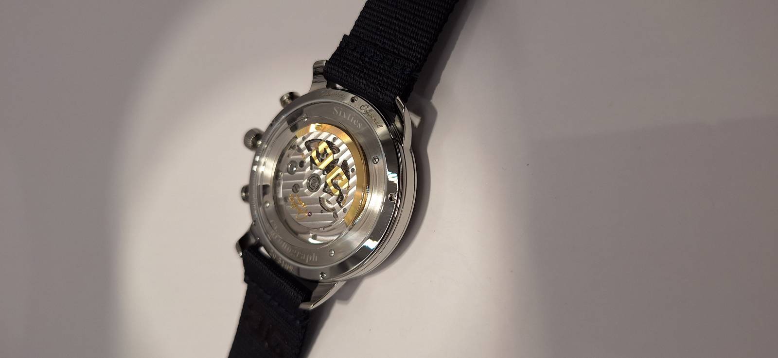 Orologio nuovo, carica automatica, cronografo con indicazione dei secondi e dei minuti, vetro zaffiro superiore e fondello in vetro zaffiro, diametro cassa mm 42 e spessore mm 12,4, corona e pulsanti a pressione, impermeabile a 3 bar, movimento cal. 39-34 di manifattura, rotore con applicazioni in oro 21 Kt