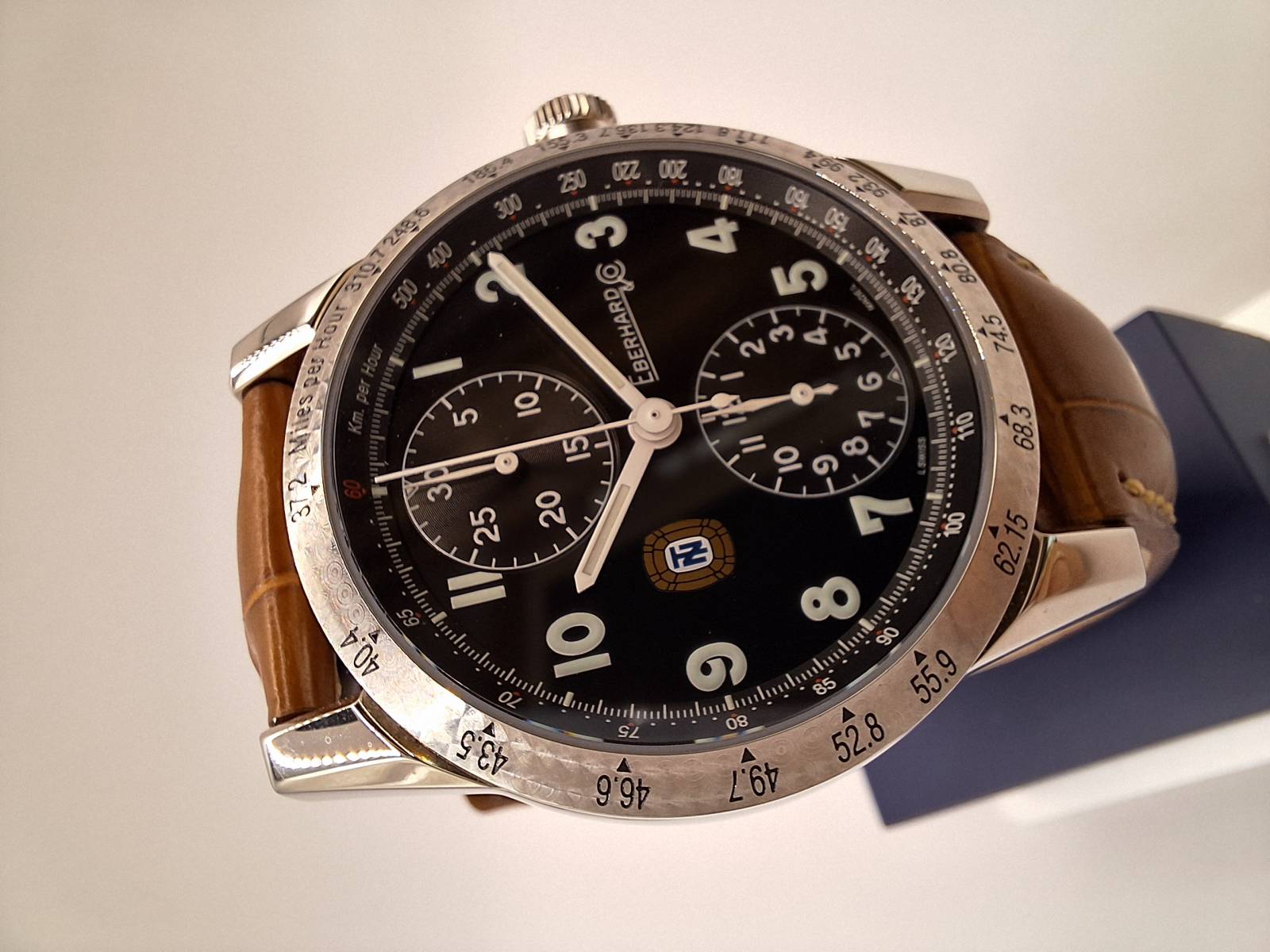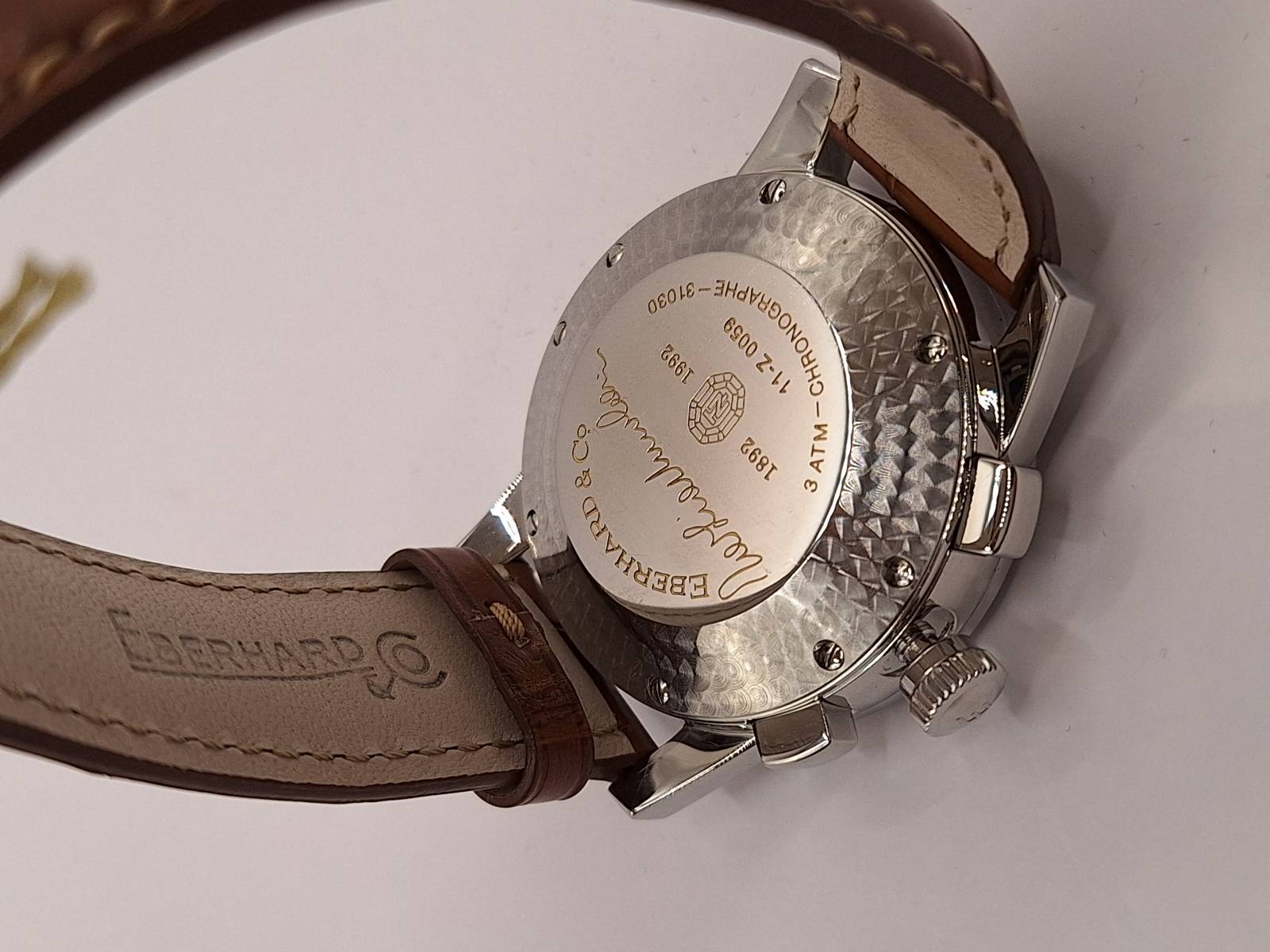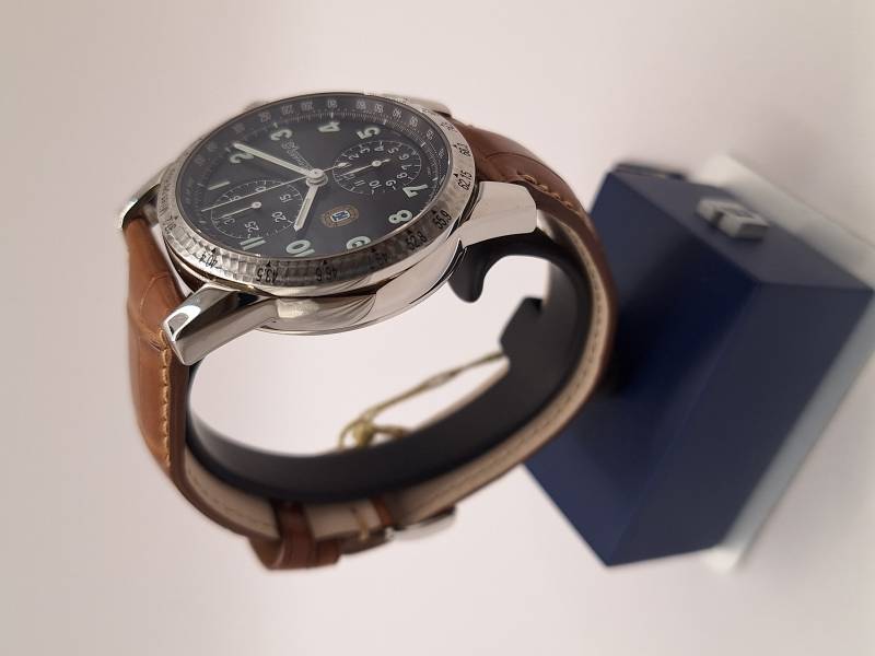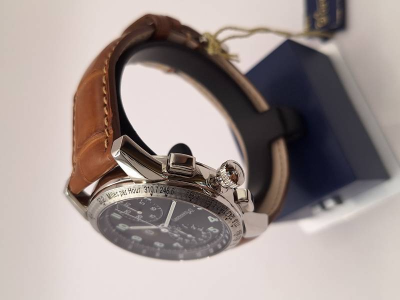 Versione grand taille del tradizionale modello della Maison. Cronografo a carica automatica con totalizzatore dei minuti e dei secondi. Cassa in acciaio diametro 43 mm e spessore mm 13, 3. Vetro zaffiro antiriflesso e fondello in acciaio serrato da otto viti ed inciso con la firma del pilota e la sua tartaruga portafortuna. Ghiera e fondello con lavorazione a rosette per ricordare la strumentazione delle auto d'epoca. Corona a vite e pulsanti a pressione. Impermeabilità a 3 atm.