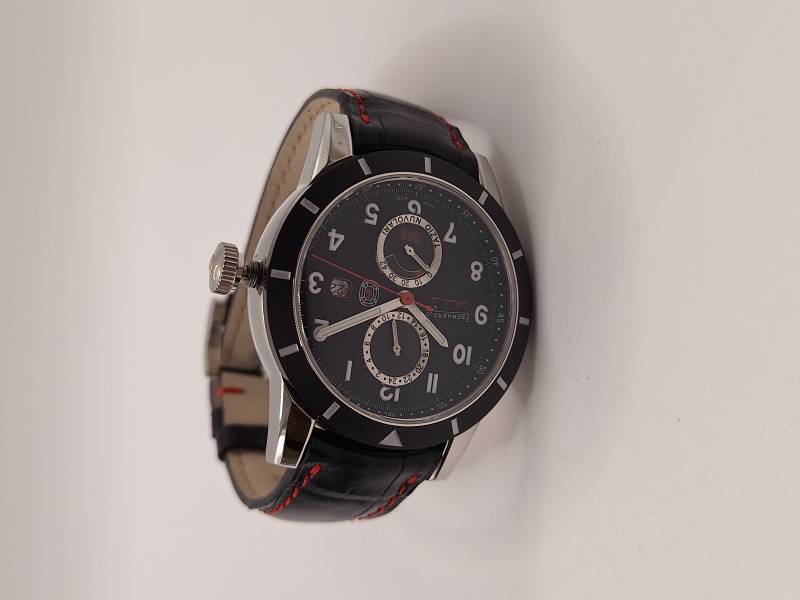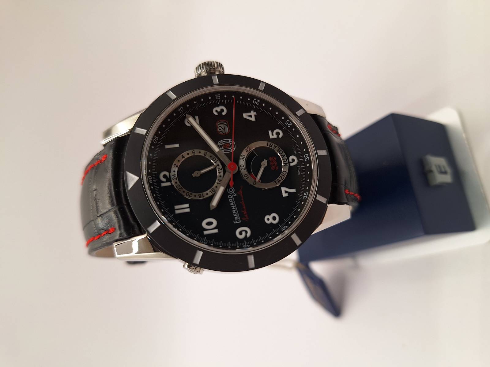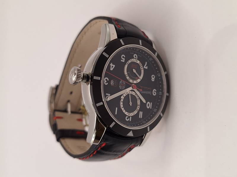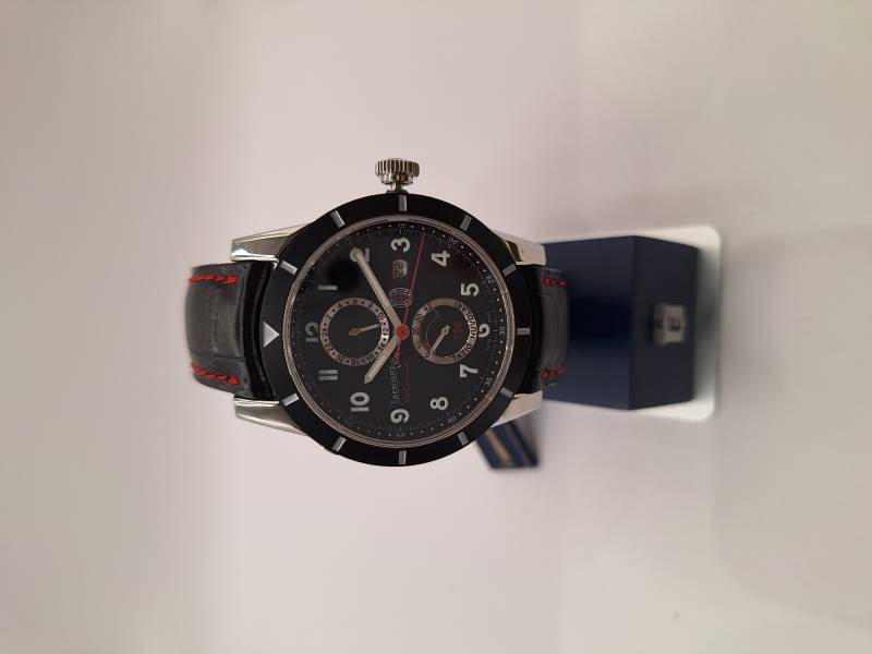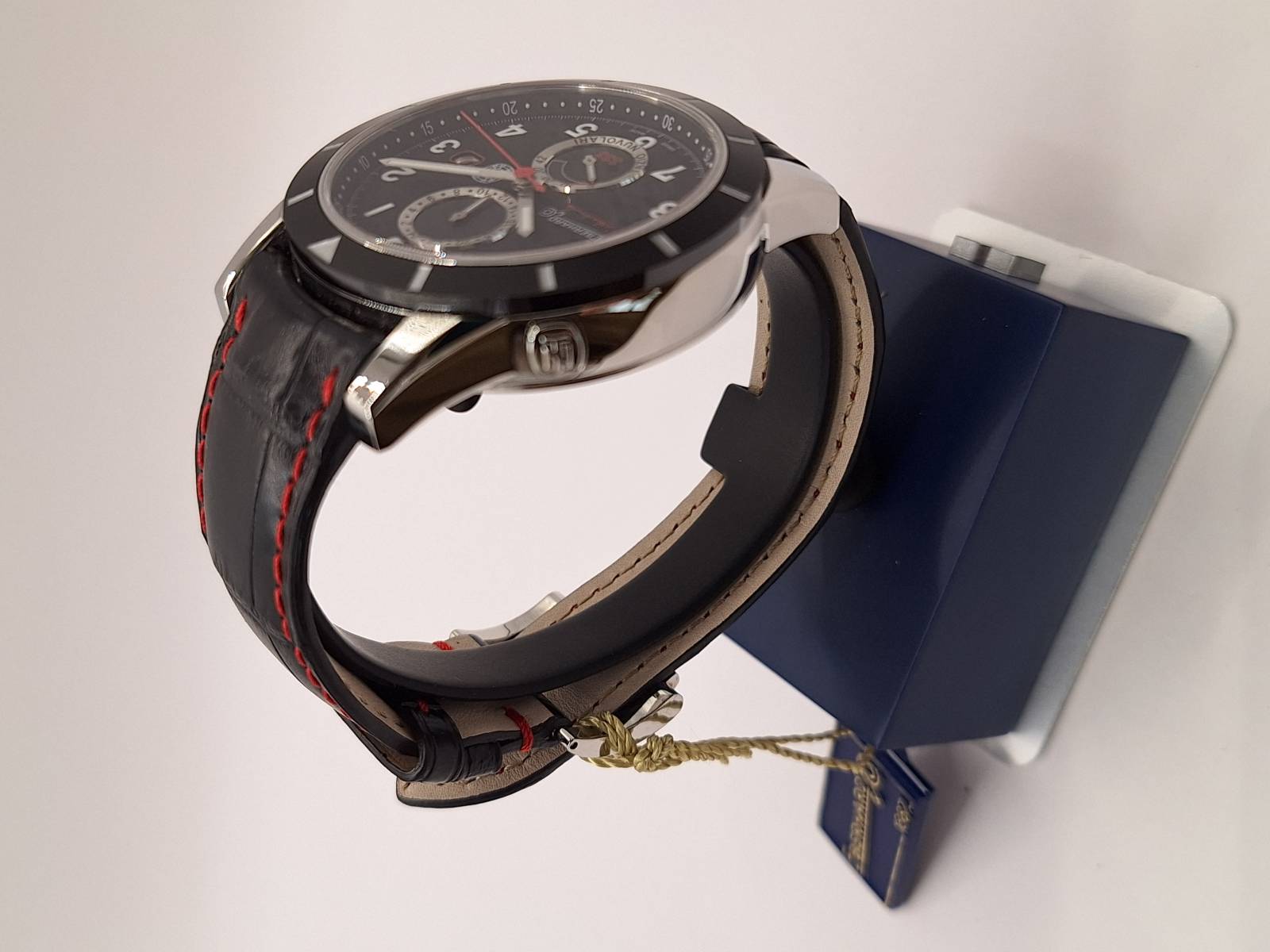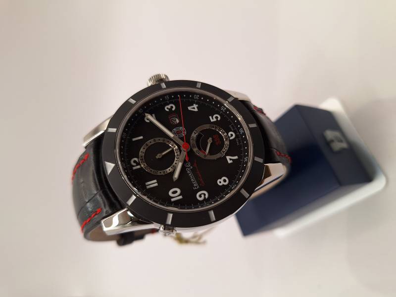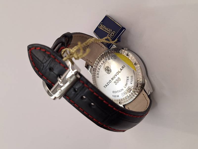 Cronografo a carica automatica dedicato alla famosa vittoria di Nuvolari nella Vanderbilt Cup nel 1936 con totalizzatori delle ore, dei minuti e dei secondi.Il pulsante di azzeramento del cronografo è inserito coassialmente alla corona di regolazione per ricordare i cronografi della Maison prodotti in quegli anni. Cassa in acciaio diametro mm 42 con fondello a cerniera apribile a scatto tramite uno speciale pulsante a scorrimento verticale. All'interno del fondello sono incisi la tartaruga stilizzata portafortuna del pilota, le sue iniziali ed un cartiglio per le incisioni. Un doppio fondo in vetro zaffiro rende visibile il movimento particolarmente rifinito e caratterizzato dalla presenza di 30 rubini, viti in metallo azzurrato e lavorazioni a perlage e Cotes de Genève. Vetro zaffiro bombato antiriflesso e impermeabilità a 3 atm.