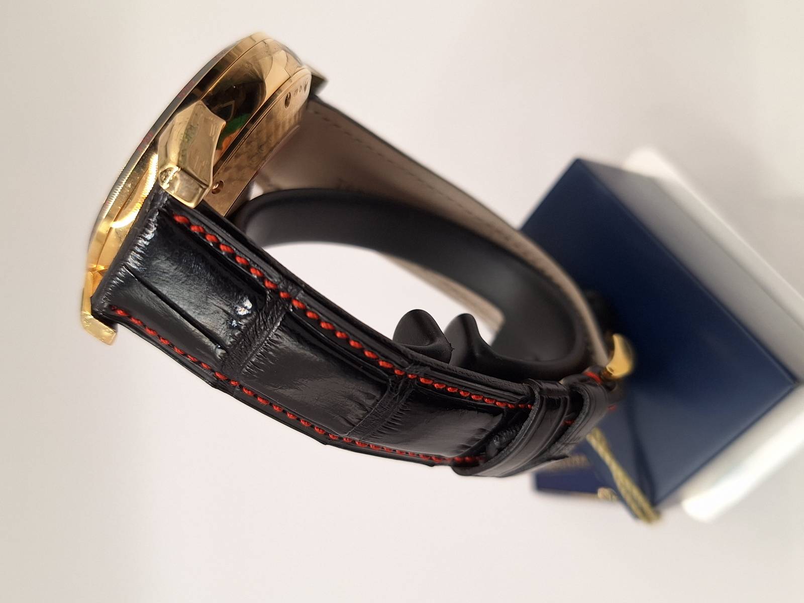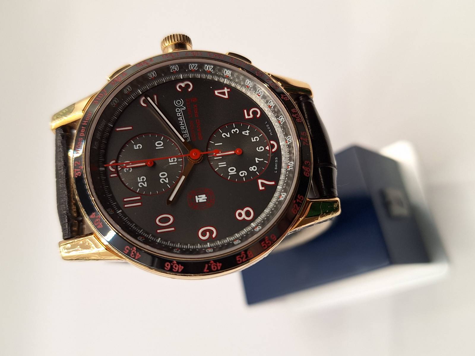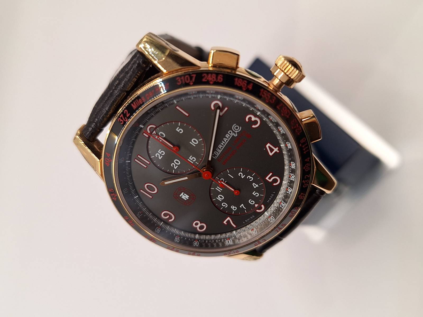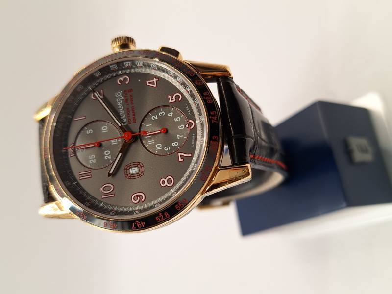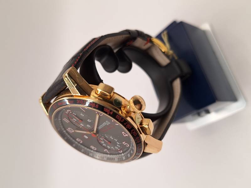 Versione Dual Time dell'iconico modello della Maison dedicato a Tazio Nuvolari. Orologio a carica automatica con datario ed indicazione di un secondo fuso orario ad ore 12 e della riserva di carica ad ore 6. Cassa in acciaio diametro 44,5 mm e spessore mm 12,5. Vetro zaffiro antiriflesso e fondello in acciaio con lavorazione perlée fermato da otto viti. Ghiera in acciaio trattato al PVD e corona a vite. Impermeabilità a 10 atm. Edizione limitata di 336 pezzi, esemplare n. 190
