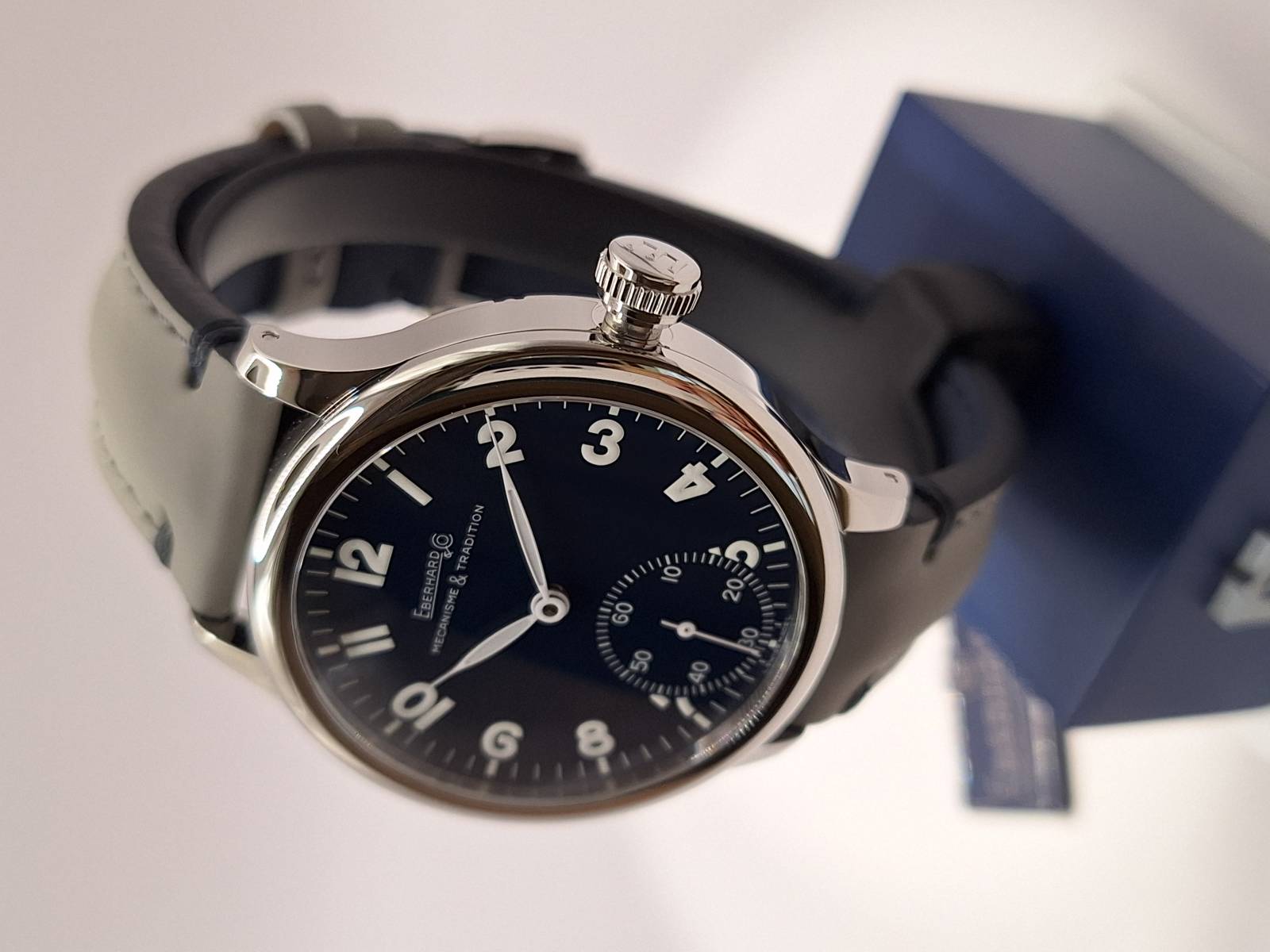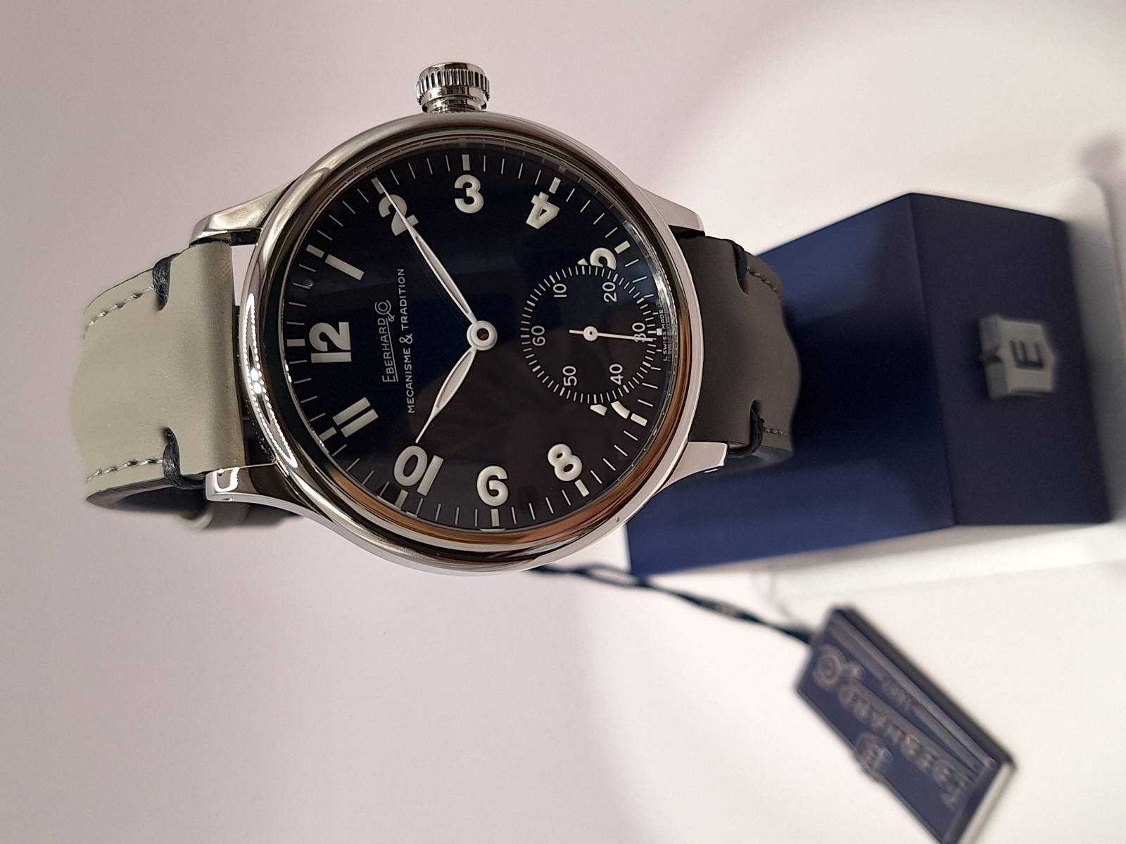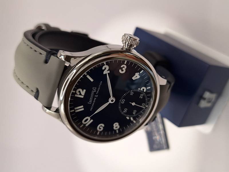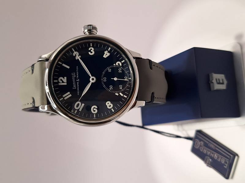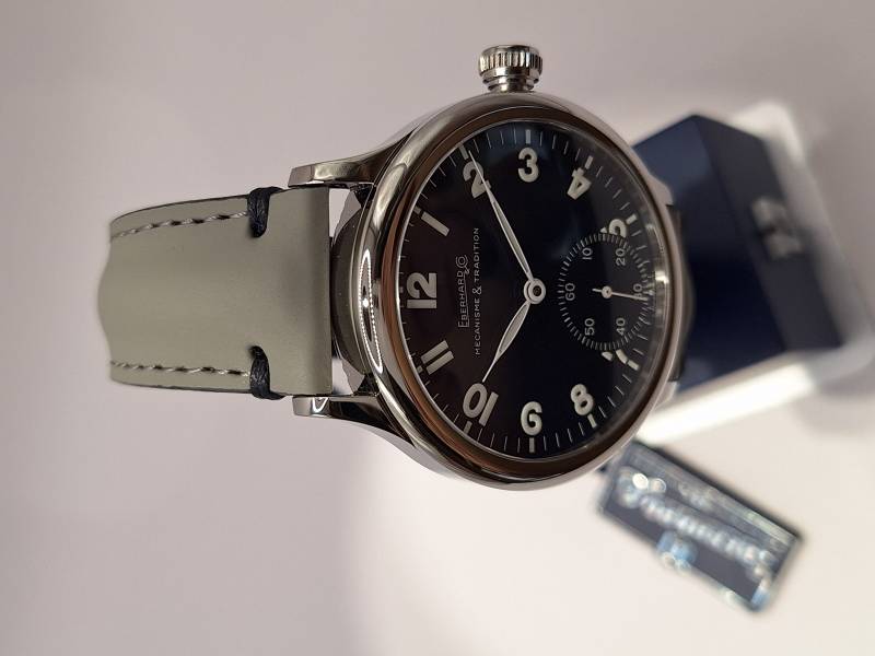 Orologio nuovo a carica manuale con indicazione di ore, minuti e piccoli secondi al 6. Quadrante con numeri arabi e corona a pressione. Vetro zaffiro superiore e fondello in acciaio con incisioni. Diametro cassa mm 43 e spessore mm 11,7