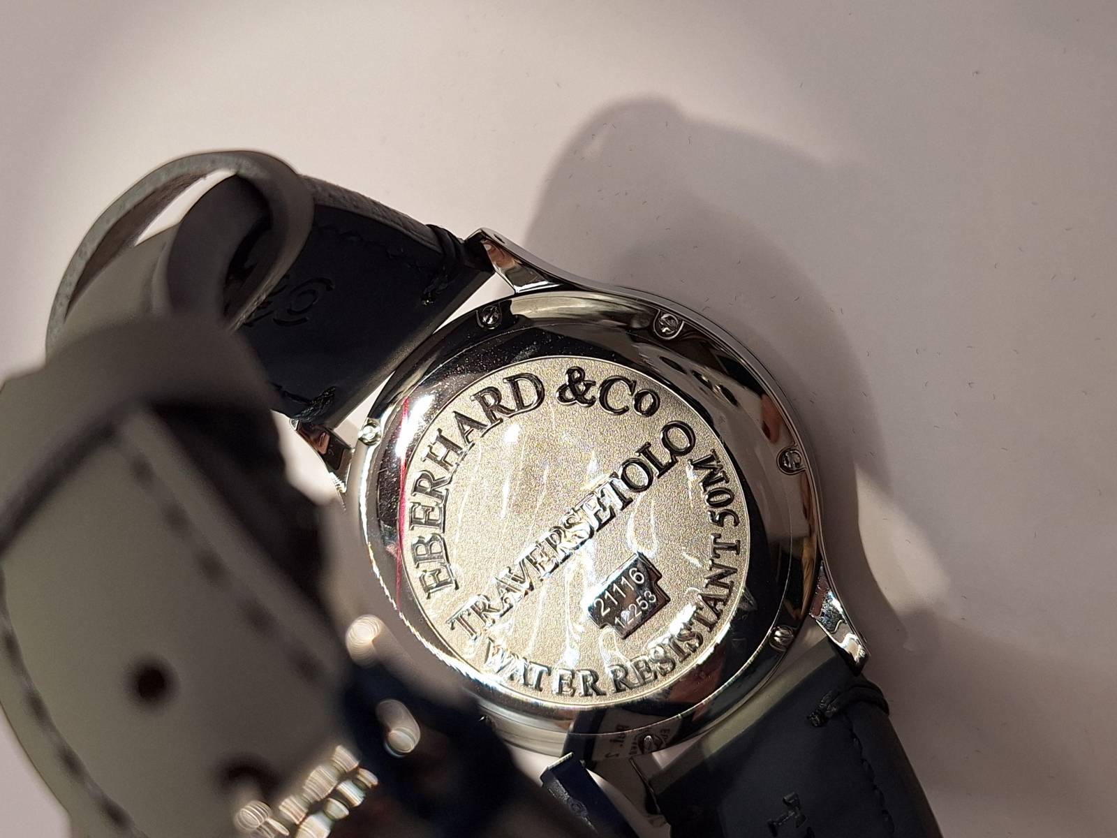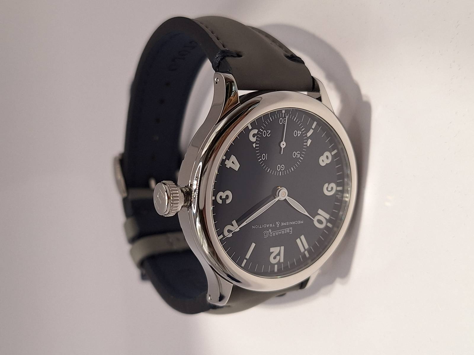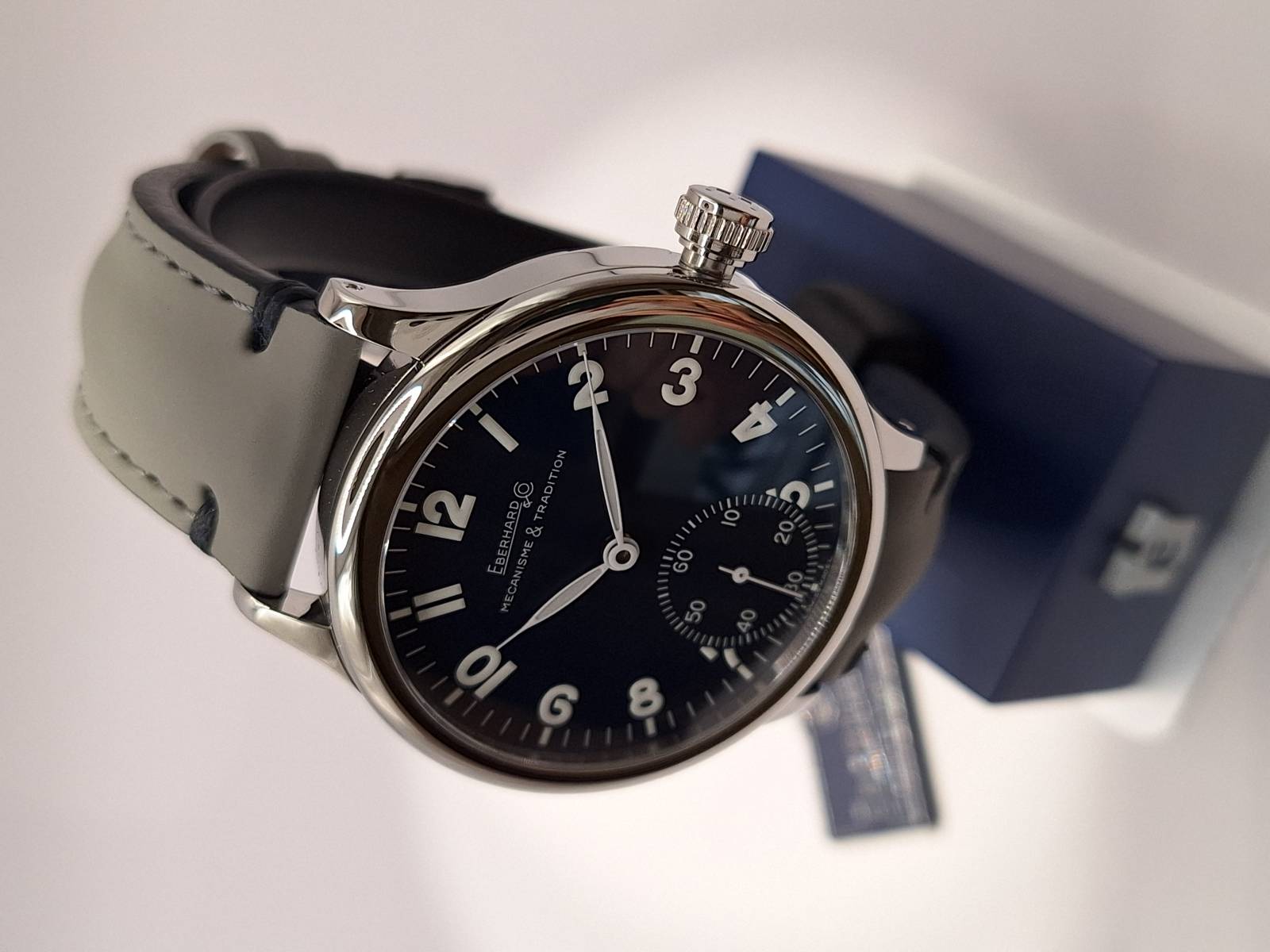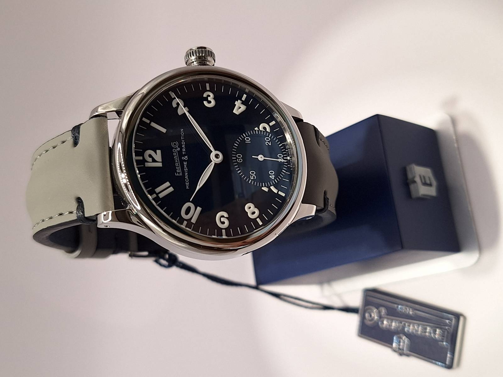 Orologio nuovo a carica manuale con indicazione di ore, minuti e piccoli secondi al 6. Quadrante con numeri arabi e corona a pressione. Vetro zaffiro superiore e fondello in acciaio con incisioni. Diametro cassa mm 43 e spessore mm 11,7
