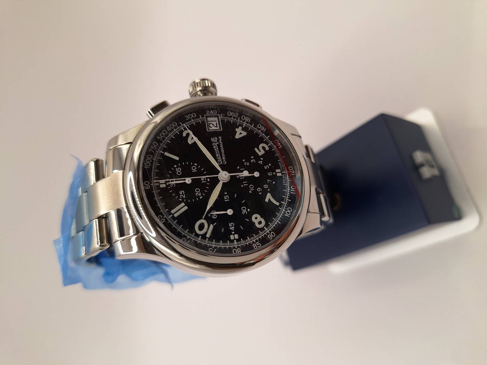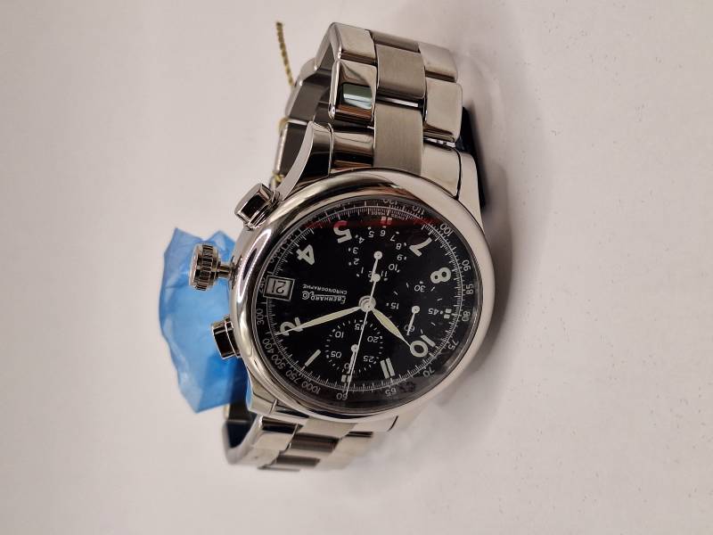Orologio nuovo a carica manuale con indicazione di ore, minuti e piccoli secondi al 6. Quadrante con numeri arabi e corona a pressione. Vetro zaffiro superiore e fondello in vetro zaffiro. Diamtreo mm 43 e spessore di mm 11,7