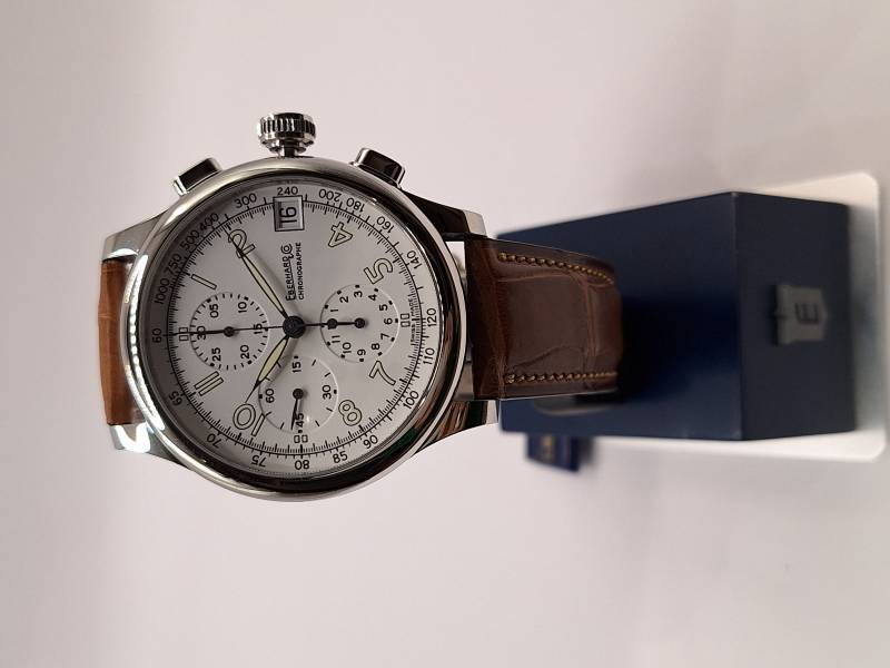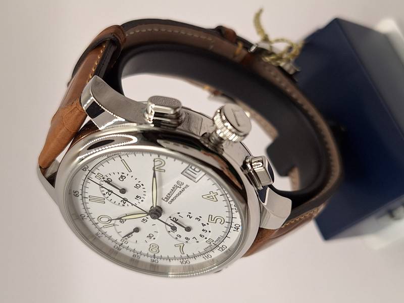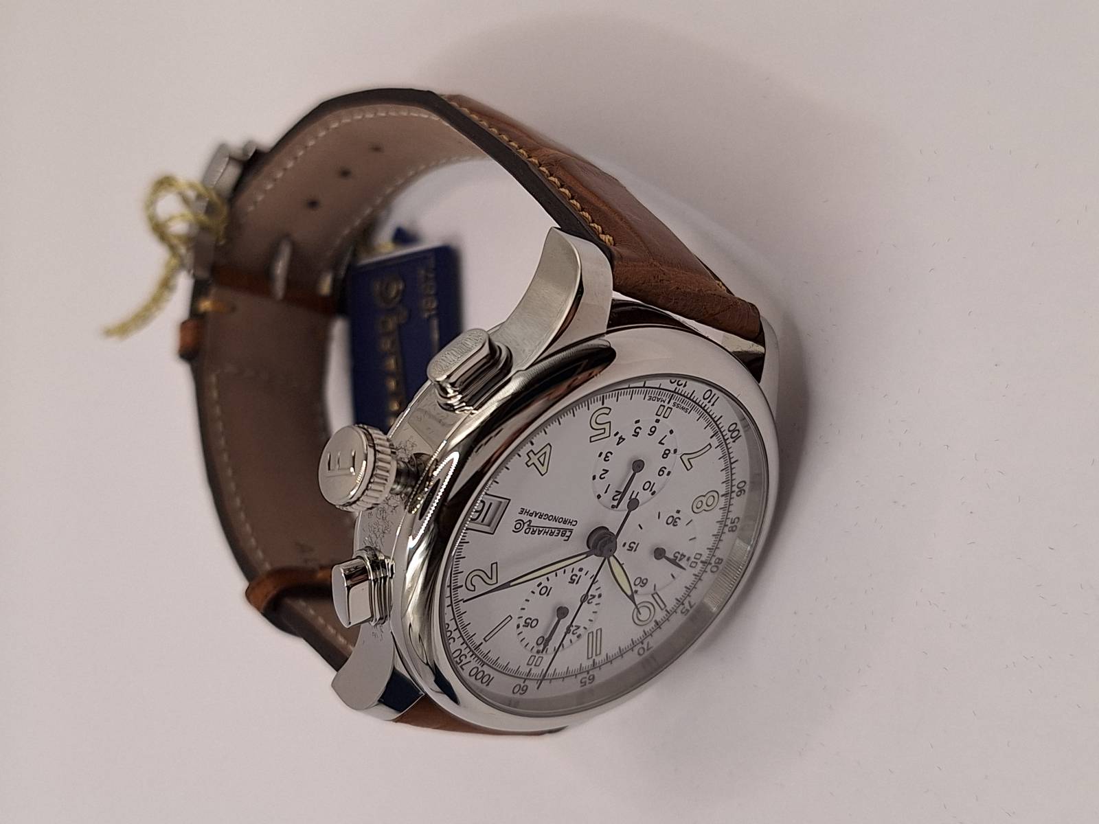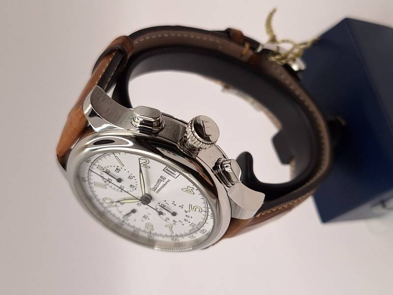Orologio nuovo a carica automatica con cronografo e totalizzatore delle ore, minuti e secondi. Cassa di mm 43 in acciaio trattato al carbonio. Corona a vite e pulsanti a pressione. Vetro zaffiro superiore e fondello in vetro zaffiro fissato da otto viti. Cassa numero 258 di Edizione in serie limitata di 333 pezzi